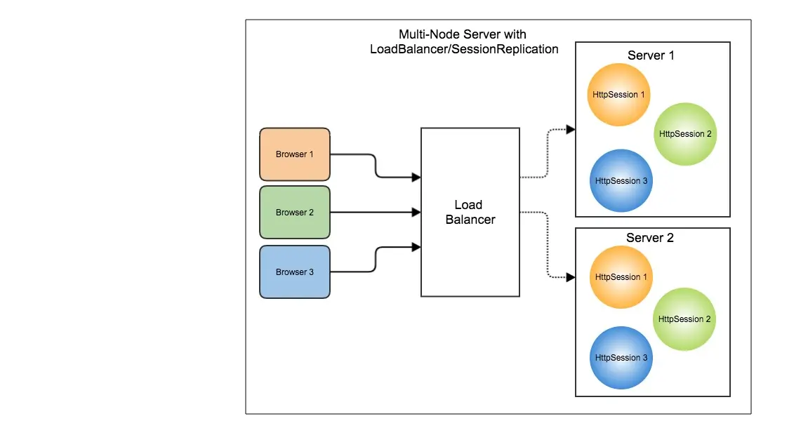 在此模型中,将在所有服务器节点上复制用户会话数据,以便可以将任何请求路由到任何服务器节点。即使一个节点发生故障,客户端请求也可以由另一个节点提供服务。