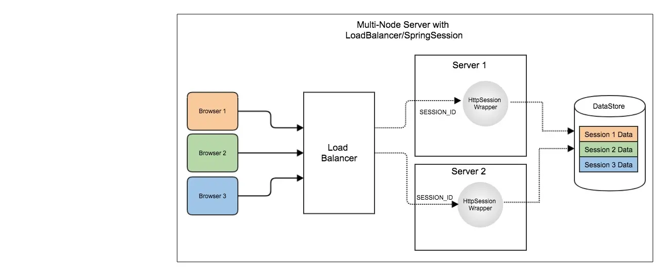 在此模型中,用户会话数据不会保存在服务器的内存中,而是将其持久保存到数据存储中并将其与SESSION_ID关联。
