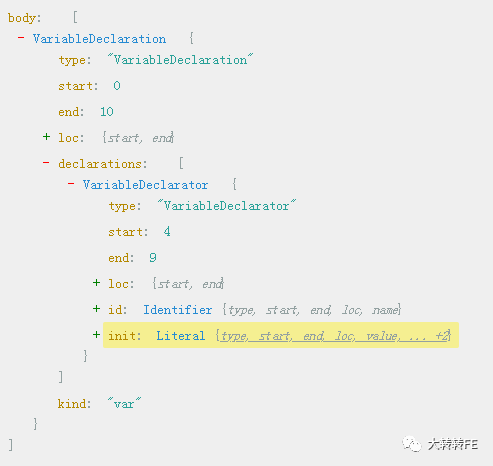 这句简单的 JavaScript 代码通过 AST 将被解析成一颗“有点复杂”的语法树: