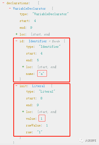 这句话从语法层面分析是一次变量声明和赋值,所以父节点是一个 type 为 VariableDeclaration(变量声明)的类型节点,声明的内容又包括两部分,标识符:a 和 初始值:1