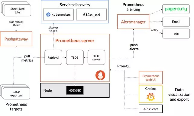 上图为 Prometheus 的官方系统架构图,而实现 TiPrometheus ,用到了上图中没有体现到的一个 Prometheus 的功能:Remote Storage ,如其名所示,其主要功能是给 Prometheus 提供了远程写的能力,这个功能对于查询是透明的,主要用于长存储。而我们当时的 TiPrometheus 实现了基于 TiKV 以及 PD 实现的 Prometheus 的 Remote Storage 。