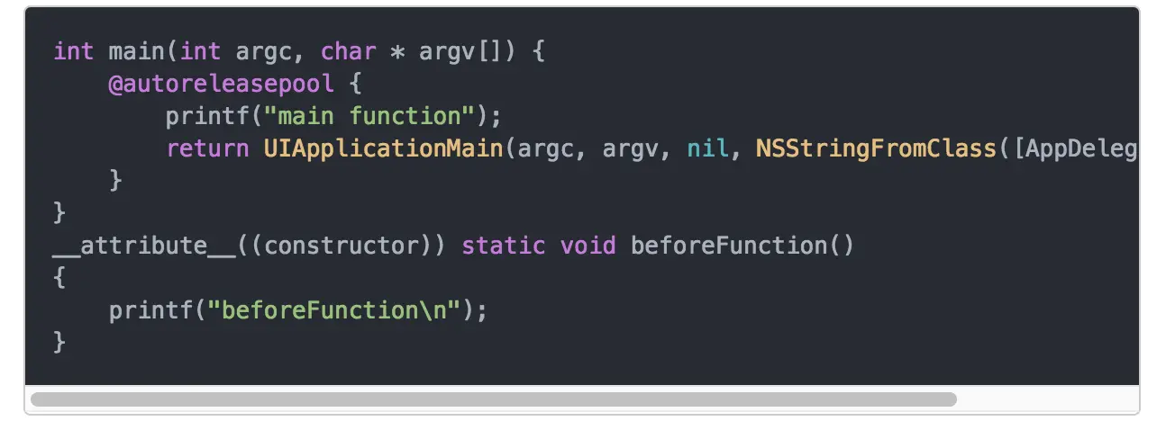 下面我们在研究下什么叫rebase指针调整和bind符号绑定。首先我们确定一下这个是动作是谁做的。是dyld做的。dyld是什么?动态库连接器。怎么样链接动态库?为什么要链接动态库?因为加载了mach-o二进制文件后,动态库是独立的,dyld要将所有动态库绑定起来。mach-o动态库上面要写上要绑定的动态库的指针和数据,用来修正(fix-up),修正有两种类型,一种叫rebasing,一种叫binding。为什么要修正呢?据说在iOS4.3以前不需要修正,后来有了ASLR(address space layoutrandomization)的存在,可执行文件和动态链接库在虚拟内存中的加载地址每次启动都不固定,所以需要这2步来修复镜像中的资源指针,来指向正确的地址。 rebase修复的是指向当前镜像内部的资源指针; 而bind指向的是镜像外部的资源指针。 第三点进行类的注册优化起来就很明了,就是我们尽可能减少类的数量,就可以减少加载时间。第四个,初始化执行load方法也很简单就是少些+load()方法,attribute((constructor)) 修饰的函数调用就是1个函数可以在main函数之前调用,有什么作用还不清楚,我没用过,如图: