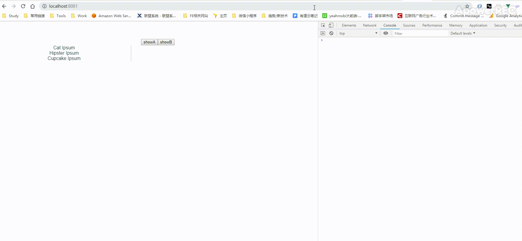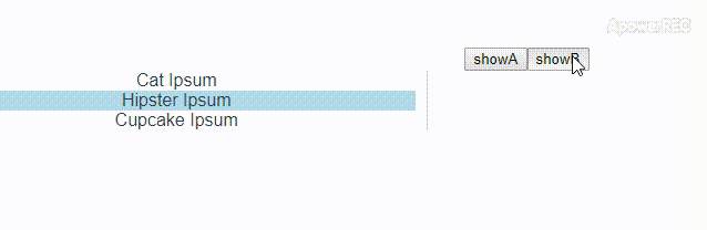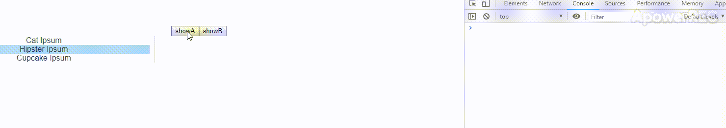 <template><div> <!-- 按钮,用于切换组件 --> <button @click="currentTabComponent= 'A'">showA</button> <button @click="currentTabComponent= 'B'">showB</button> <!-- 动态切换显隐,组件 --> <component :is="currentTabComponent"></component></div></template><script>//引入组件A以及组件Bimport A from "./A.vue";import B from "./B.vue"; export default { data() { return { //默认显示组件A,若字符串为B则显示组件B,name在component内声明 showWhat: "A" }; }, methods: { handleClick(tab, event) { console.log(tab, event); } }, components: { //声明组件A,B A, B }, methods:{ } };</script><style>.tab-button { padding: 6px 10px; border-top-left-radius: 3px; border-top-right-radius: 3px; border: 1px solid #ccc; cursor: pointer; background: #f0f0f0; margin-bottom: -1px; margin-right: -1px;}.tab-button:hover { background: #e0e0e0;}.tab-button.active { background: #e0e0e0;}.tab { border: 1px solid #ccc; padding: 10px;}.posts-tab { display: flex;}.posts-sidebar { max-width: 40vw; margin: 0; padding: 0 10px 0 0; list-style-type: none; border-right: 1px solid #ccc;}.posts-sidebar li { white-space: nowrap; text-overflow: ellipsis; overflow: hidden; cursor: pointer;}.posts-sidebar li:hover { background: #eee;}.posts-sidebar li.selected { background: lightblue;}.selected-post-container { padding-left: 10px;}.selected-post > :first-child { margin-top: 0; padding-top: 0;}</style><template> <ul class="posts-sidebar"> <li v-for="post in posts" v-bind:key="post.id" v-bind:class="{ selected: post === selectedPost }" v-on:click="selectedPost = post" > {{ post.title }} </li> </ul> </ul></template><script>export default { name:'A', data() { return{ selectedPost: null, posts: [ { id: 1, title: 'Cat Ipsum', content: '<p>Dont wait for the storm to pass, dance in the rain kick up litter decide to want nothing to do with my owner today demand to be let outside at once, and expect owner to wait for me as i think about it cat cat moo moo lick ears lick paws so make meme, make cute face but lick the other cats. Kitty poochy chase imaginary bugs, but stand in front of the computer screen. Sweet beast cat dog hate mouse eat string barf pillow no baths hate everything stare at guinea pigs. My left donut is missing, as is my right loved it, hated it, loved it, hated it scoot butt on the rug cat not kitten around</p>' }, { id: 2, title: 'Hipster Ipsum', content: '<p>Bushwick blue bottle scenester helvetica ugh, meh four loko. Put a bird on it lumbersexual franzen shabby chic, street art knausgaard trust fund shaman scenester live-edge mixtape taxidermy viral yuccie succulents. Keytar poke bicycle rights, crucifix street art neutra air plant PBR&B hoodie plaid venmo. Tilde swag art party fanny pack vinyl letterpress venmo jean shorts offal mumblecore. Vice blog gentrify mlkshk tattooed occupy snackwave, hoodie craft beer next level migas 8-bit chartreuse. Trust fund food truck drinking vinegar gochujang.</p>' }, { id: 3, title: 'Cupcake Ipsum', content: '<p>Icing dessert soufflé lollipop chocolate bar sweet tart cake chupa chups. Soufflé marzipan jelly beans croissant toffee marzipan cupcake icing fruitcake. Muffin cake pudding soufflé wafer jelly bear claw sesame snaps marshmallow. Marzipan soufflé croissant lemon drops gingerbread sugar plum lemon drops apple pie gummies. Sweet roll donut oat cake toffee cake. Liquorice candy macaroon toffee cookie marzipan.</p>' } ], } }}</script>B.vue