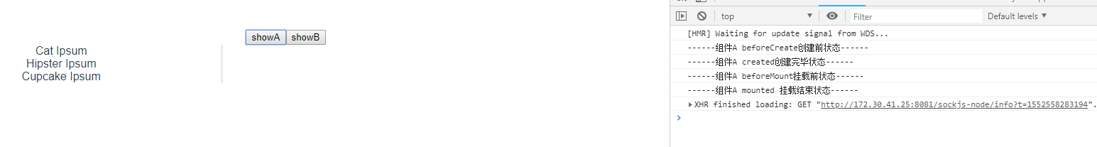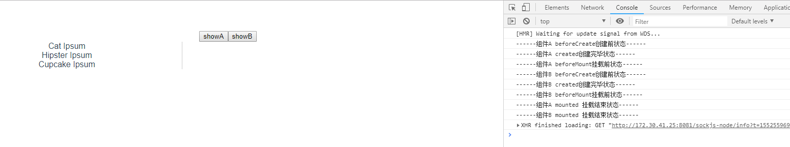 demo到这里,我们来说一说为什么不用 v-show 来切换呢, V-show 会第一时间加载两个组件, 两个组件的生命周期都会触发,会造成不必要的性能浪费,代码改一下: