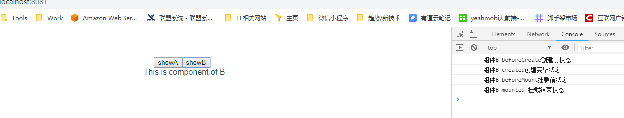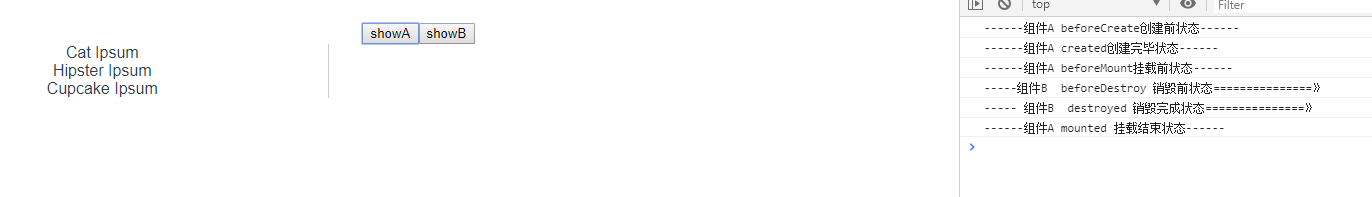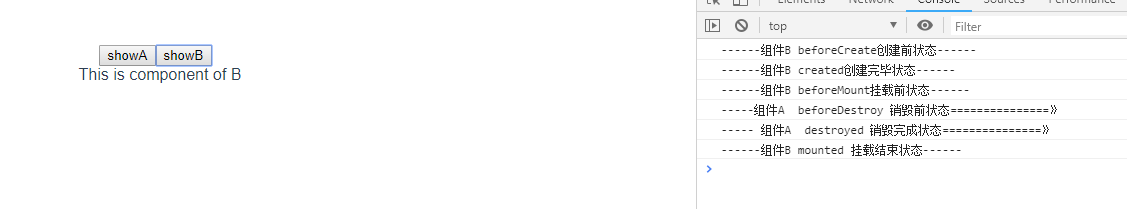 切换至B(为了看起来方便,我先清除了console),触发了组件B的生命周期