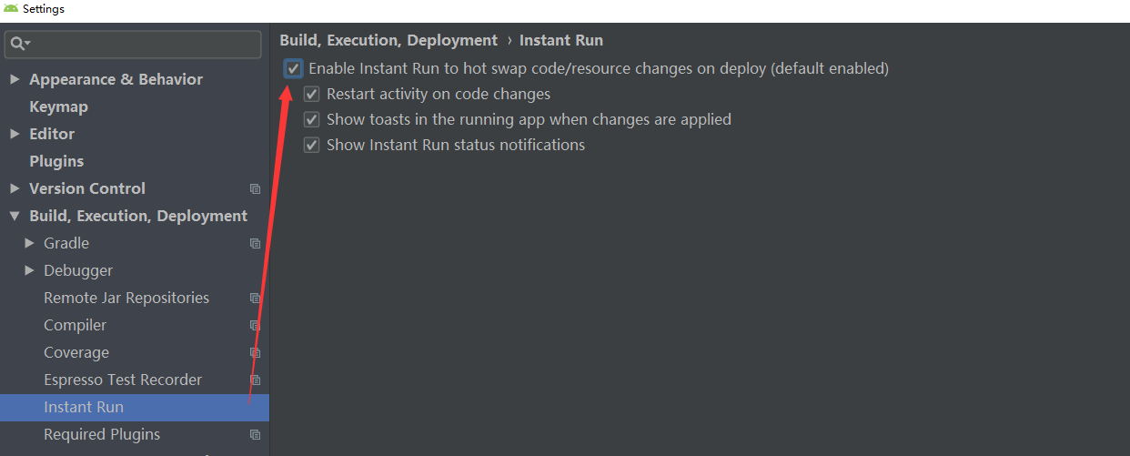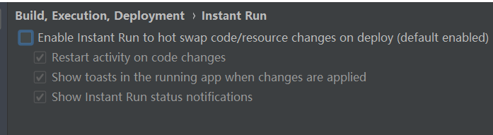 File ----> settings -----> Build,Exceution,Deployment ----> Instant Run 然后出现以下界面: