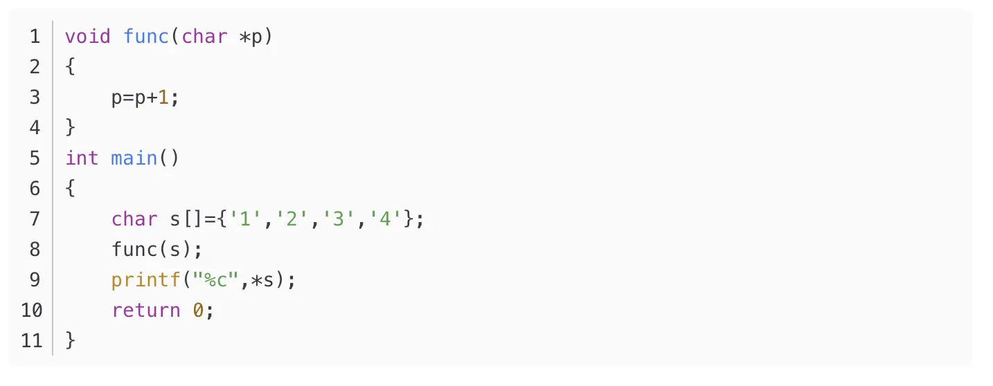 不过下面这个例子很狡猾,就是指针作为形参时,实参s只是把地址传递给了形参p,在函数体内,p指针指向了下一个内存地址,因此原内存地址中的内容并未改变,p指针变量的如何变化与S无关,除非p指针改变了实参所指向位置的内存单元中的数值,那么访问实参所得值也会随之变化。