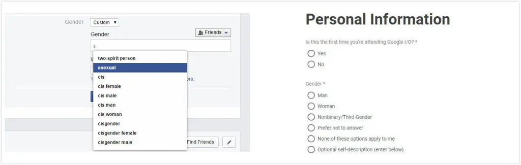 尤其是社交类型的软件,不仅有很多专为少数性向人群设计的 app,包括 Facebook 早在 2014 年就开始注重性别和性向类型的区分,将在用户的性别选项中,将原本的二项选择增添到了 58 项之多,包括 Androgyne (两性人), Male to Female(男变女), Transgender Female(跨性女), Two-spirit(两魂人等)。