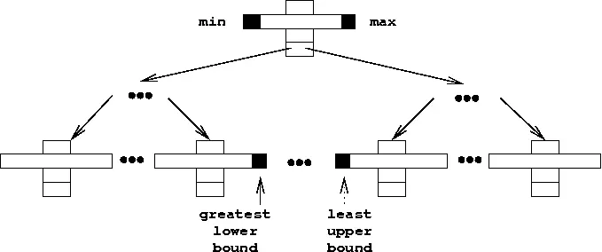 T树节点通常由指向父节点,左右子节点,有序数据指针数组和一些额外控制数据的指针组成。 具有两个子树的节点称为内部节点(internal nodes),没有子树的节点称为叶子节点(leaf nodes),而仅具有一个子树的节点称为半叶节点(half-leaf nodes)。 如果值在节点的当前最小值和最大值之间,则该节点称为(bounding node)。对于每个内部节点,它的左子树中会有一个叶子节点或半叶子节点中有一个predecessor(称为最大下限-GLB(Greatest Lower Bound)),还在右子树中包含其最大数据值的后继者(LUB-lower upper bound)的节点(包含GLB或LUP的节点或许距离参照内部节点的距离很远,但也有可能恰好相邻。正因为T-tree的每个节点是有序的,并且不同节点之间保证左子树的数据都比节点数据的最小值小,右子树的数据都比节点数据的最大值大,因此B-tree最左边的节点中最左边的数据是整棵树最小的数据,最右边的节点中的最大值是整棵树最大的数据。叶子和半叶节点中的数据元素量在1~最大元素量之间,内部节点将其占用保持在预定义的最小元素量和最大元素数之间。如图: