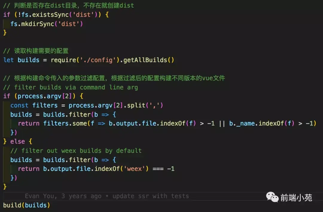 从代码可以看出,首先通过 script/config.js 文件的getAllBuilds方法获取配置,然后根据构建命令传入的参数对配置进行过滤,最后根据过滤后的配置执行build函数,编译出对应版本的vue文件。