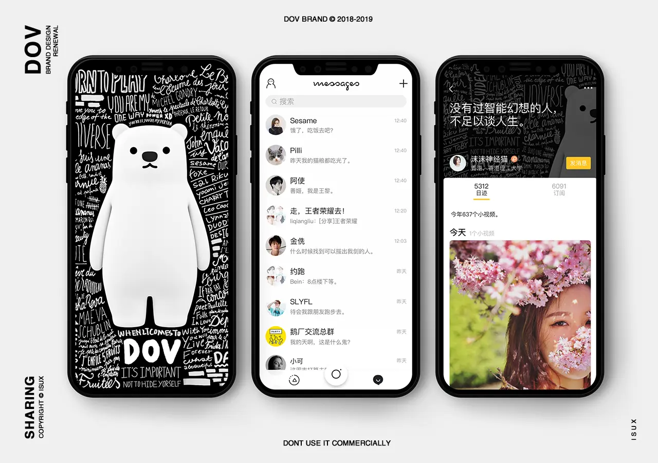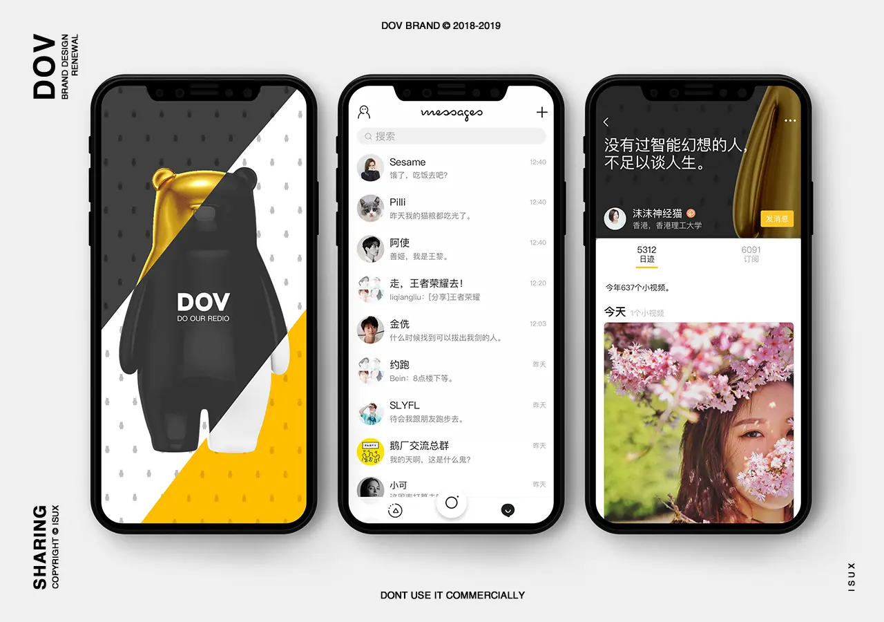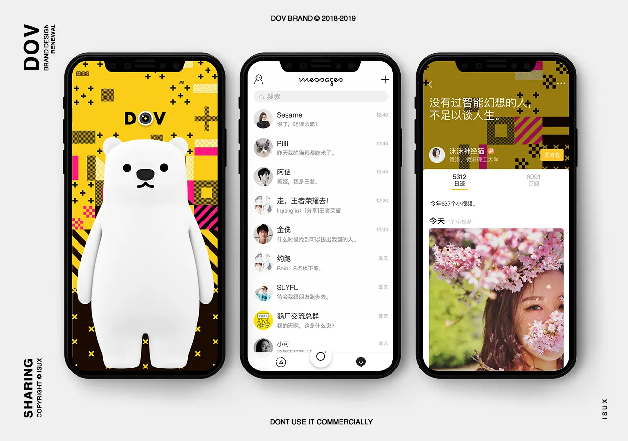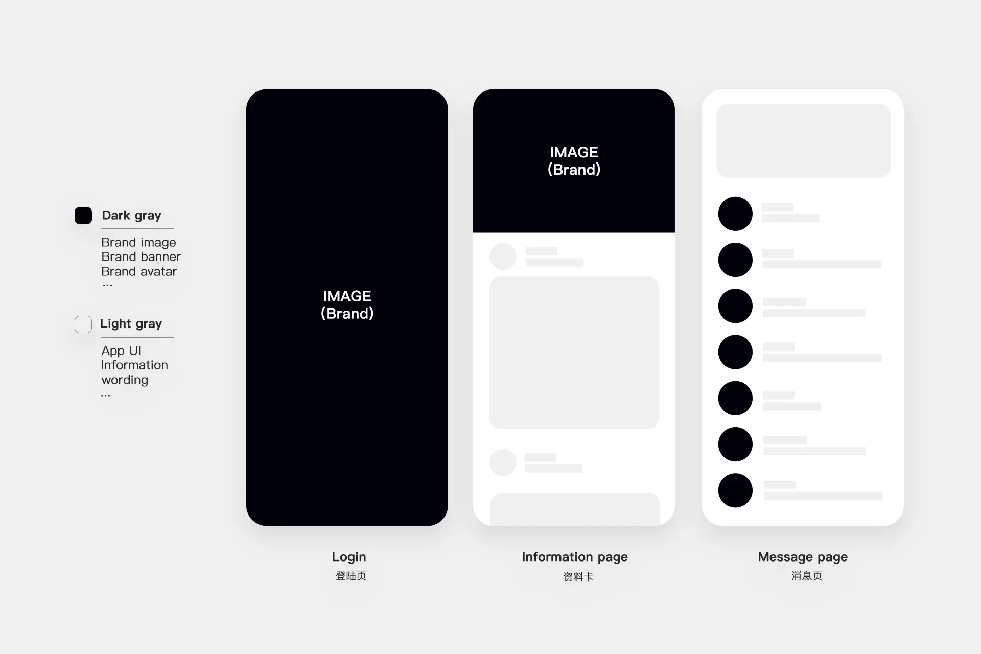 2. 高检视:必须确保方案的呈现上可以概览日后延展的各种可能,以品牌方案阶段为例,必须兼顾图像与UI的协调、大面积展示时的效果、以及最小限度展示时是否还能延续品牌的感受。在DOV提案中,设计选择了具有最大面积展空间的Login场景,保证最好的视觉效果可以被检视,其次选择资料卡,验证图像与UI面积各50%时的协调性,最后选择消息列表,确认即使几乎没有图像辅助是否还能延续品牌感受。