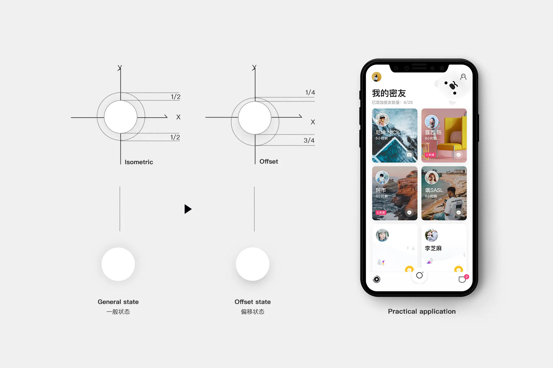 效果上一致采取了具有Y轴偏移的投影,透过营造漂浮层次过程中减少过硬的线段分隔,达到亲和的特质。