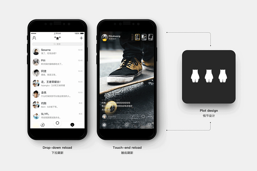 除了令人有记忆点的动效曲线以及融入品牌识别的形变,动效本身因为具有时间轴的特性,在适当的场合中可适度加入简单的动作情节,让APP的氛围更轻松有趣。(备注:DOV1.2.1版本后已无消息列表下拉刷新)