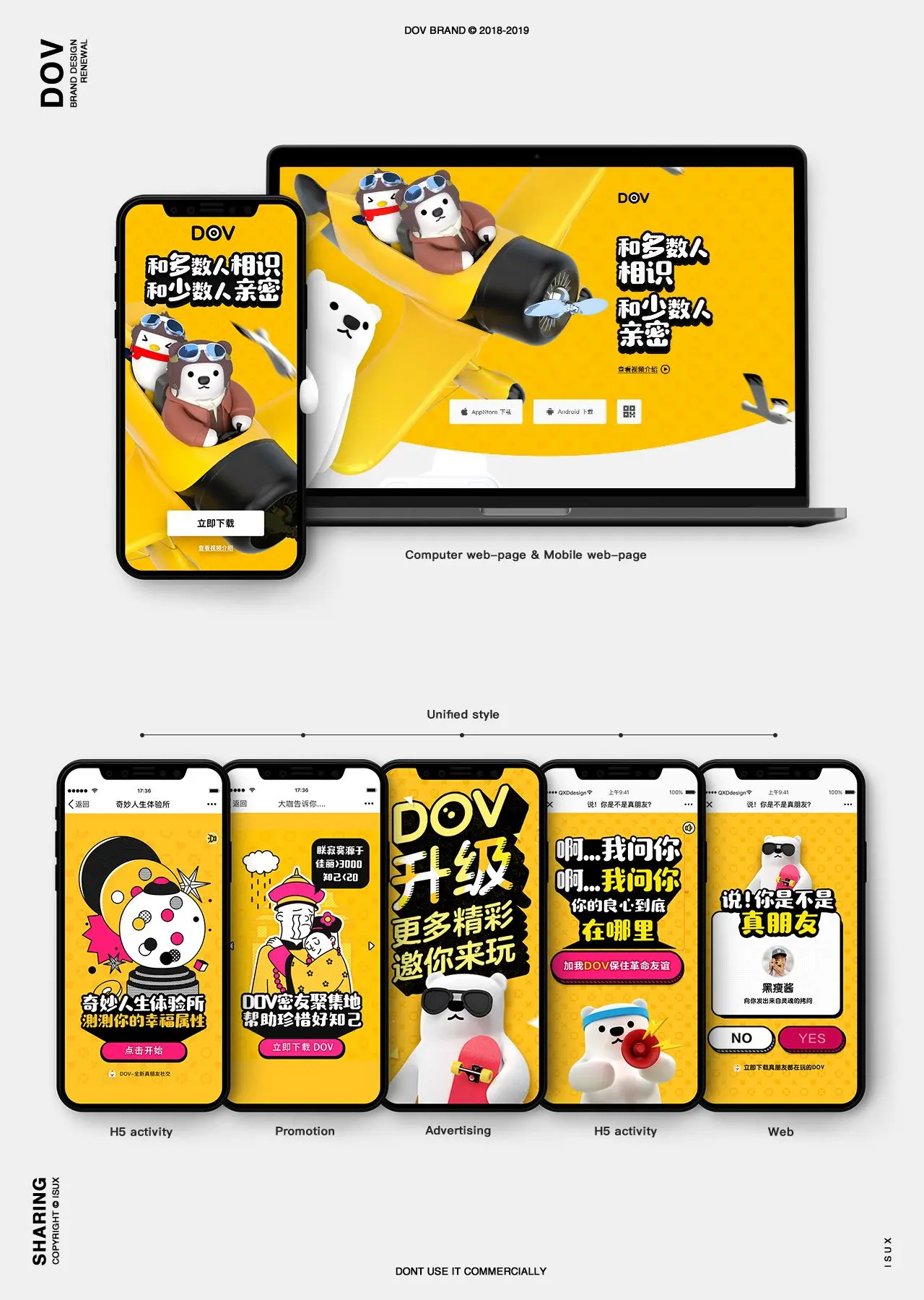 品牌化设计在过去往往发力于Logo、吉祥物、以及部分线下场景的组合运用,这类组合体现品牌传播效果上稍嫌不足,但若能全盘铺陈线上落地的场景,严格把控设计方向,不仅可以设计在多人协作的情况下轻松的把控一致调性,更可以让软件本身以及运营项目持续的强化用户记忆与设计的效率。 DOV上线后经历了两次大改版以及精简视觉设计师的投入下仍保持同样的气质以及配合产品高效的产出,证明了方法的可行也保证了后续设计体验的一致。让用户从应用中各个场景体验到品牌精神,可能将会是品牌化设计的重要趋势。