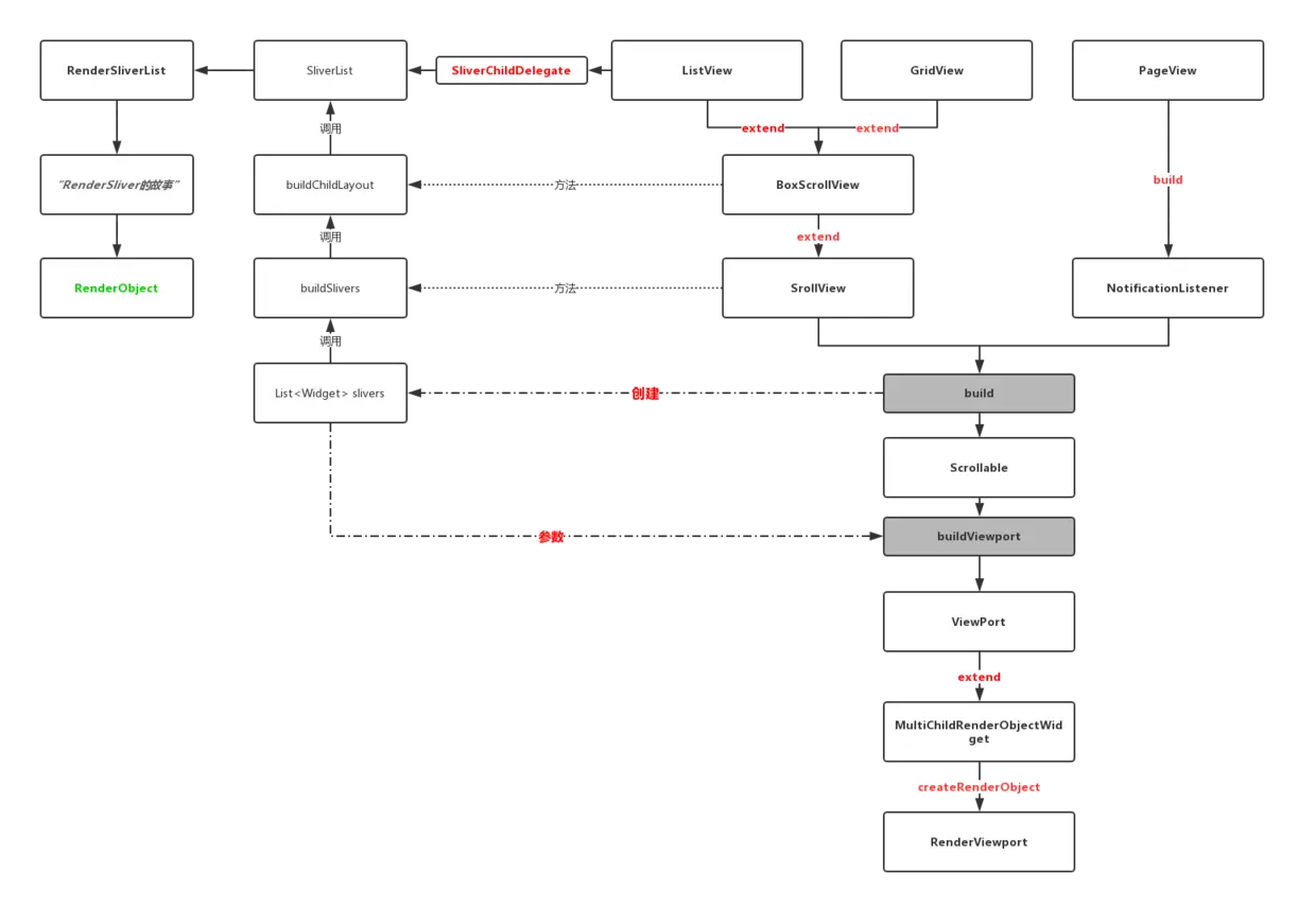 并且从 RenderViewport的说明我们知道,RenderViewport内部是不能直接放置 RenderBox,需要通过 RenderSliver 大家族来完成布局。而从源码可知:RenderViewport 对应的 Widget Viewport 就是一个 MultiChildRenderObjectWidget。 (你看,又回到 MultiChildRenderObjectWidget 了吧。)