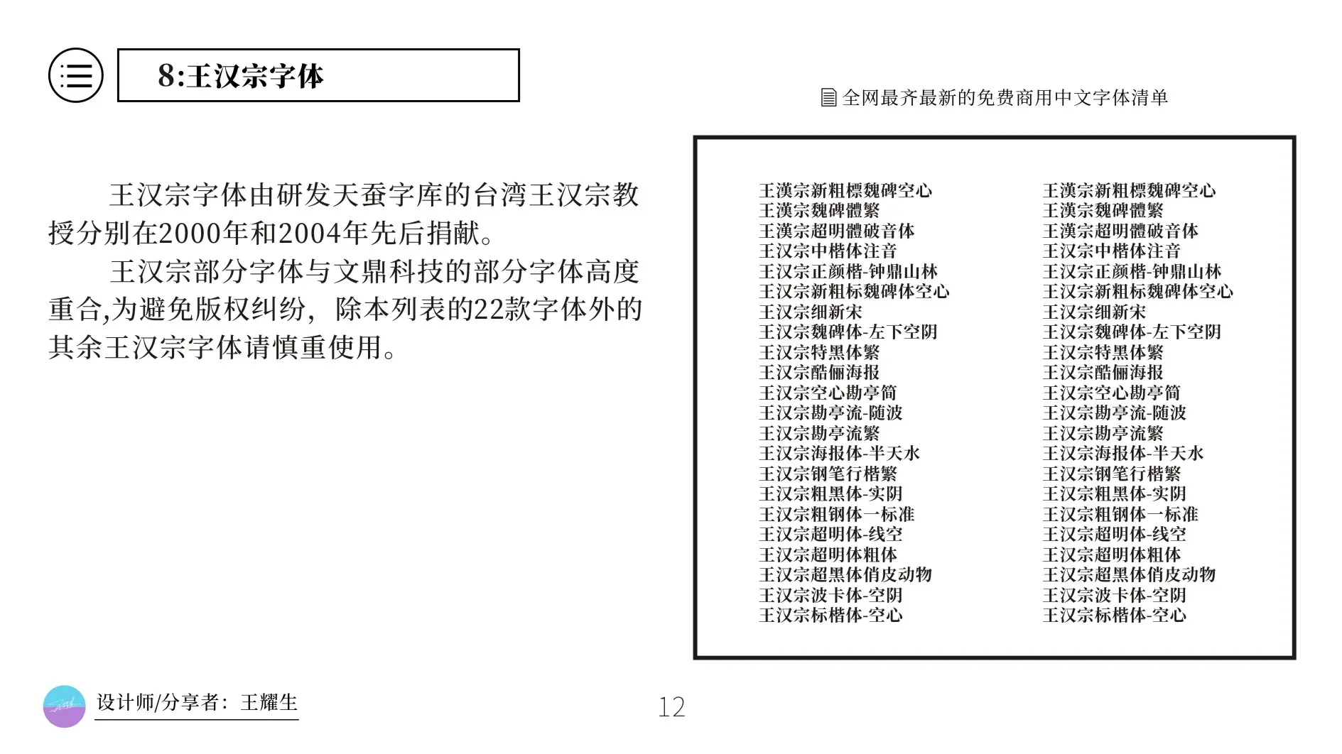 王汉宗字体系列部分字体与文鼎公司的部分字体高度相似,为了避免法律版权争议不建议商业使用。