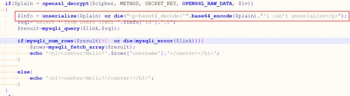3.sql查询语句拼接了一个0,所以我们只要注释掉0便可进行我们的查询。所以可以利用cbc字节翻转攻击更改密文,更改解密后的id,从而绕过进行sqlwaf,cookie传入参数 cipher和iv,base64解码然后aes解密,php反序列化,如果不能反序列化,则输出base64编码,否则就sql语句拼接查询。如果有结果回显,否则输出hello。