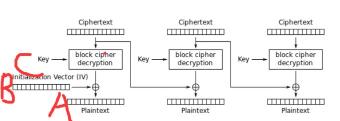 在CBC解密中,如图A是第一组的密文,B是第二组被解密的密文(未异或),C是明文。C=A^B。那么B=C^A,且A^B^C=0。如果我们更改A,A为我们可控的密文,C=A^B,如果我们使A=B^X,B=C^A,所以A=C^A^X,C=C^A^X^B=B^X^B=X。这里X是我们需要的任意字符,这便是CBC字节反转攻击的核心,这样一来C的明文就完全可控了。
