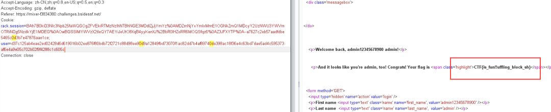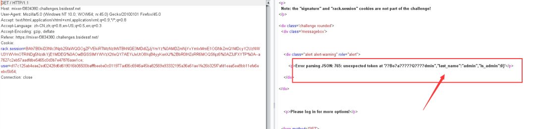 经测试修改url,get cookie post传参都不能改变is_admin的值,所以只有一种可能,是在cookie里的user参数里加密了,然后传递给服务器,我们get参数传入的账号密码被服务器端加密,然后服务器返回来加密后的user信息。