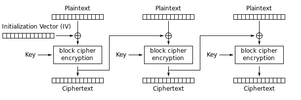 这种模式是先将明文切分成若干小段,然后每一小段与初始块或者上一段的密文段进行异或运算后,再与密钥进行加密。