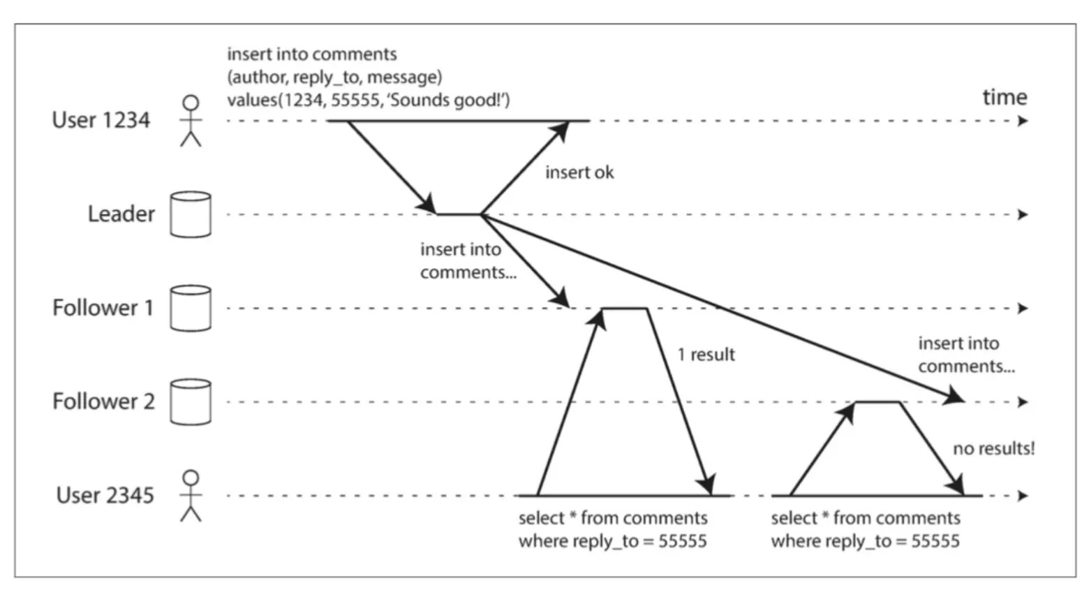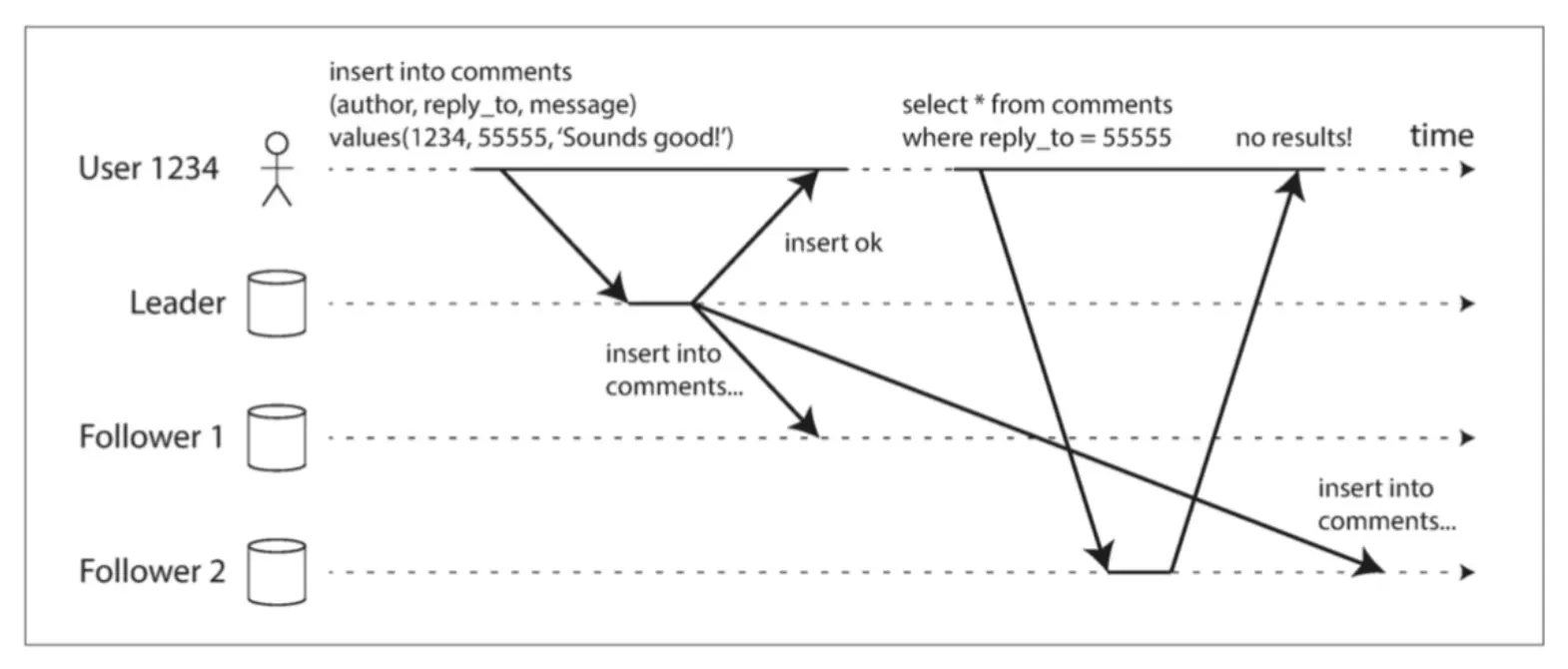 用户2345前一秒还可以查询出结果,后一秒数据就没有了。单调读是这种异常的保证机制,我们需要保证同一个用户的查询请求总是被落到同一个follower上,比如说可以根据userid取模,散列到固定的机器上。