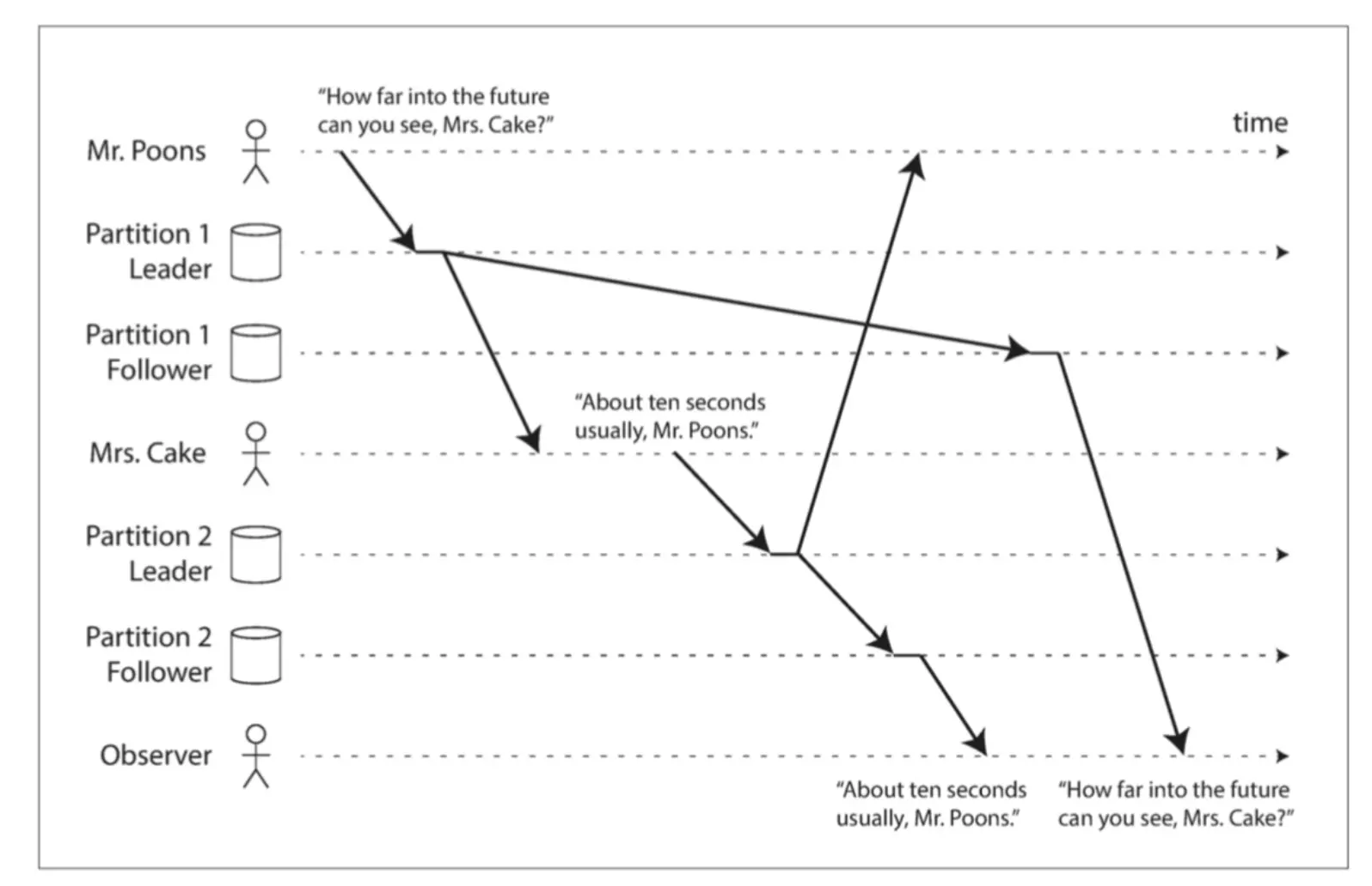 回到我们的问题,如果要解决这类问题,首先我们需要一个算法分辨出那些操作是并发的,那些操作是因果的;对于这种问问题再回答的典型的因果类型的操作,我们应该尽量让他们分配到同一个partition之内,确保有因果关系的写入到写到同一个分区。