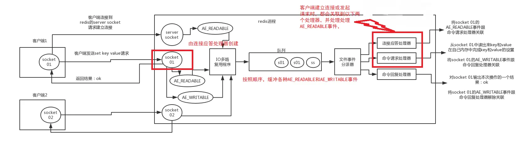 如果是客户端要写数据到redis,那么会为socket关联命令请求处理器。