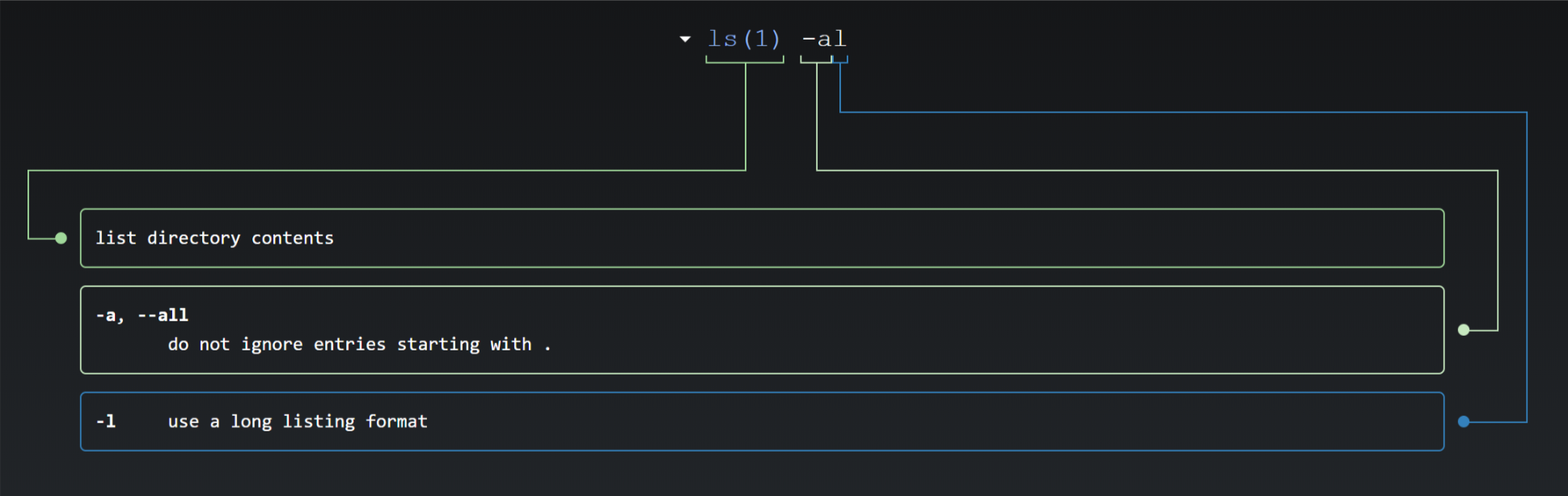 explainhell是一个工具(带有Web界面),能够解析手册页,提取选项并通过将每个参数与手册页中的相关帮助文本相匹配来解释给定的命令行。
