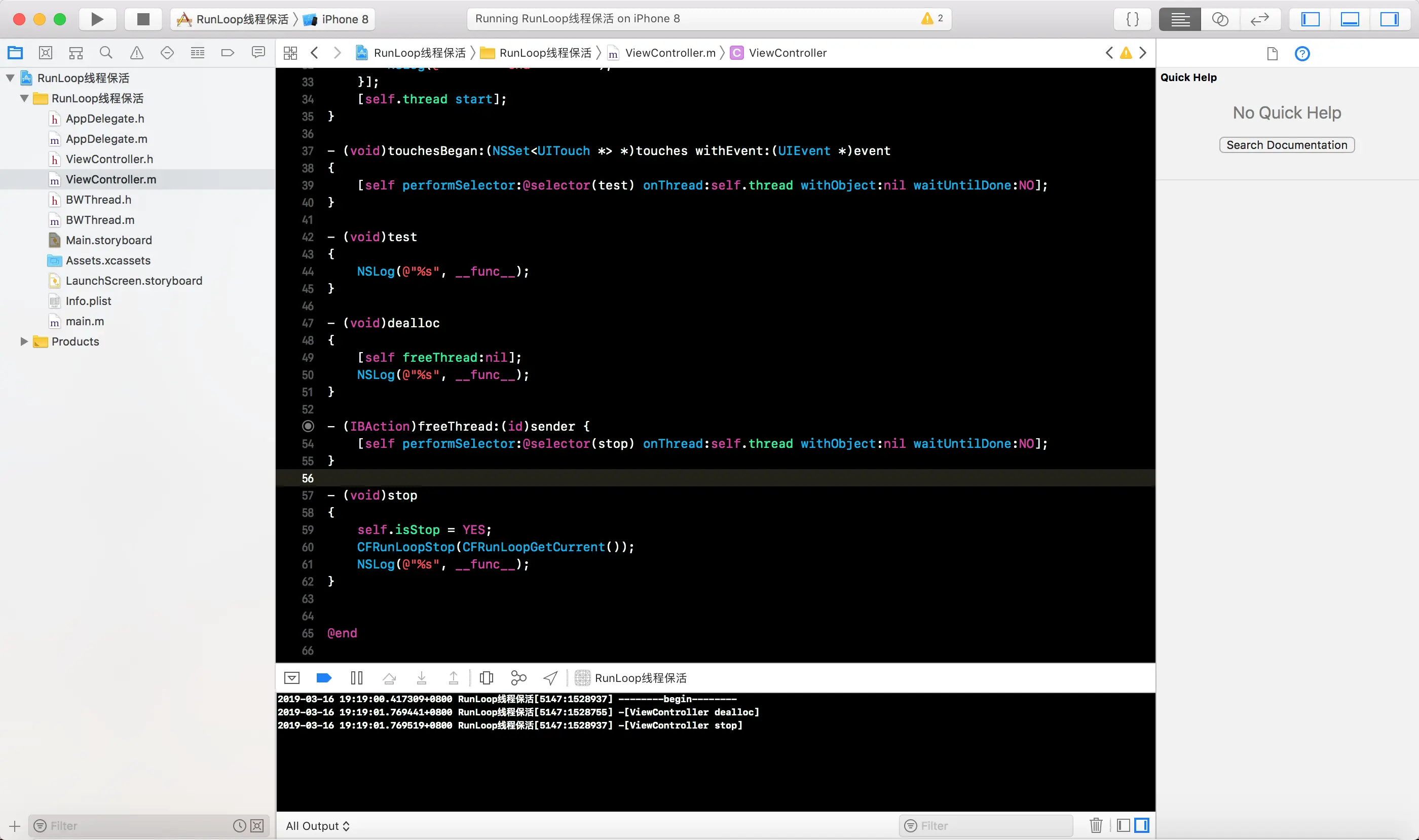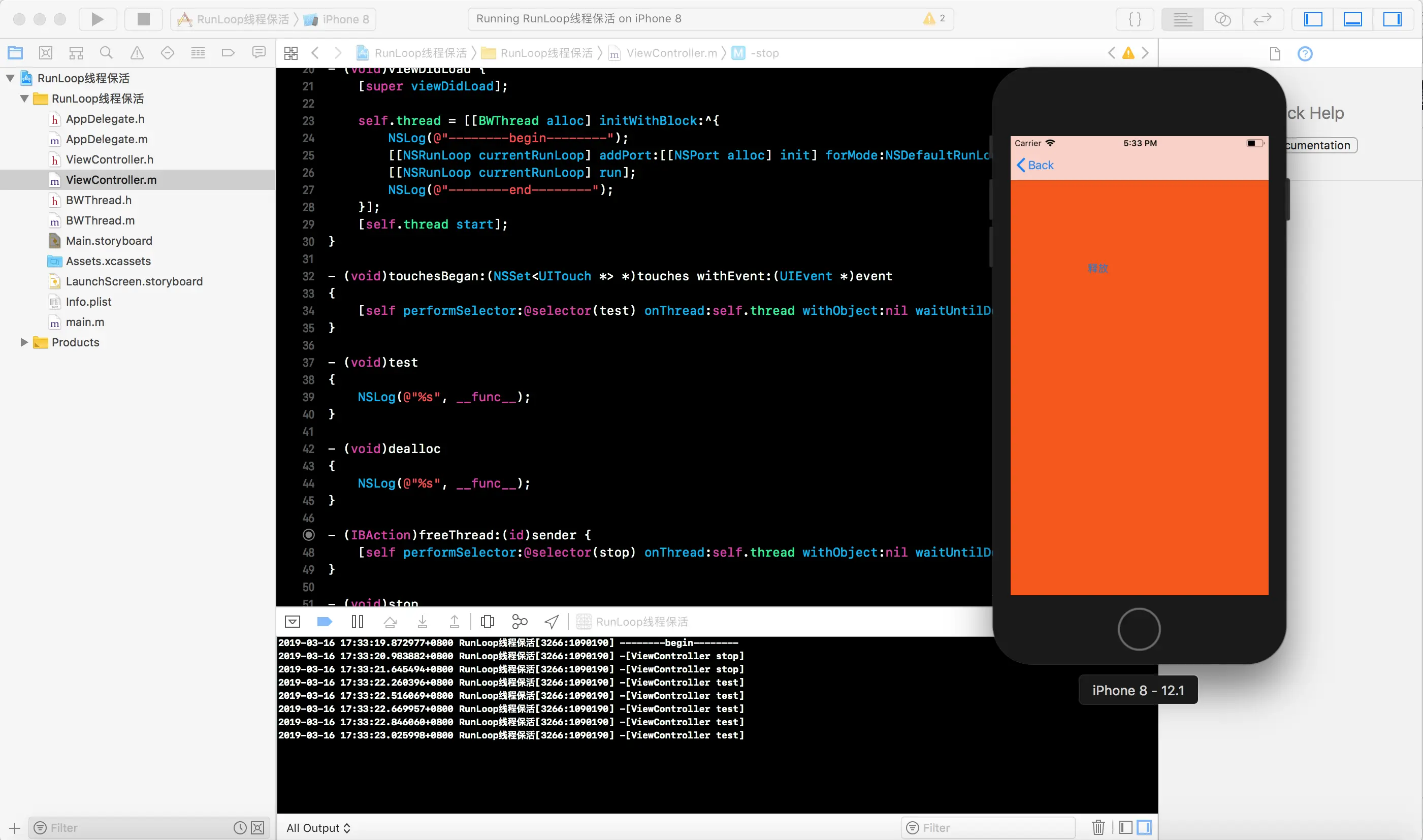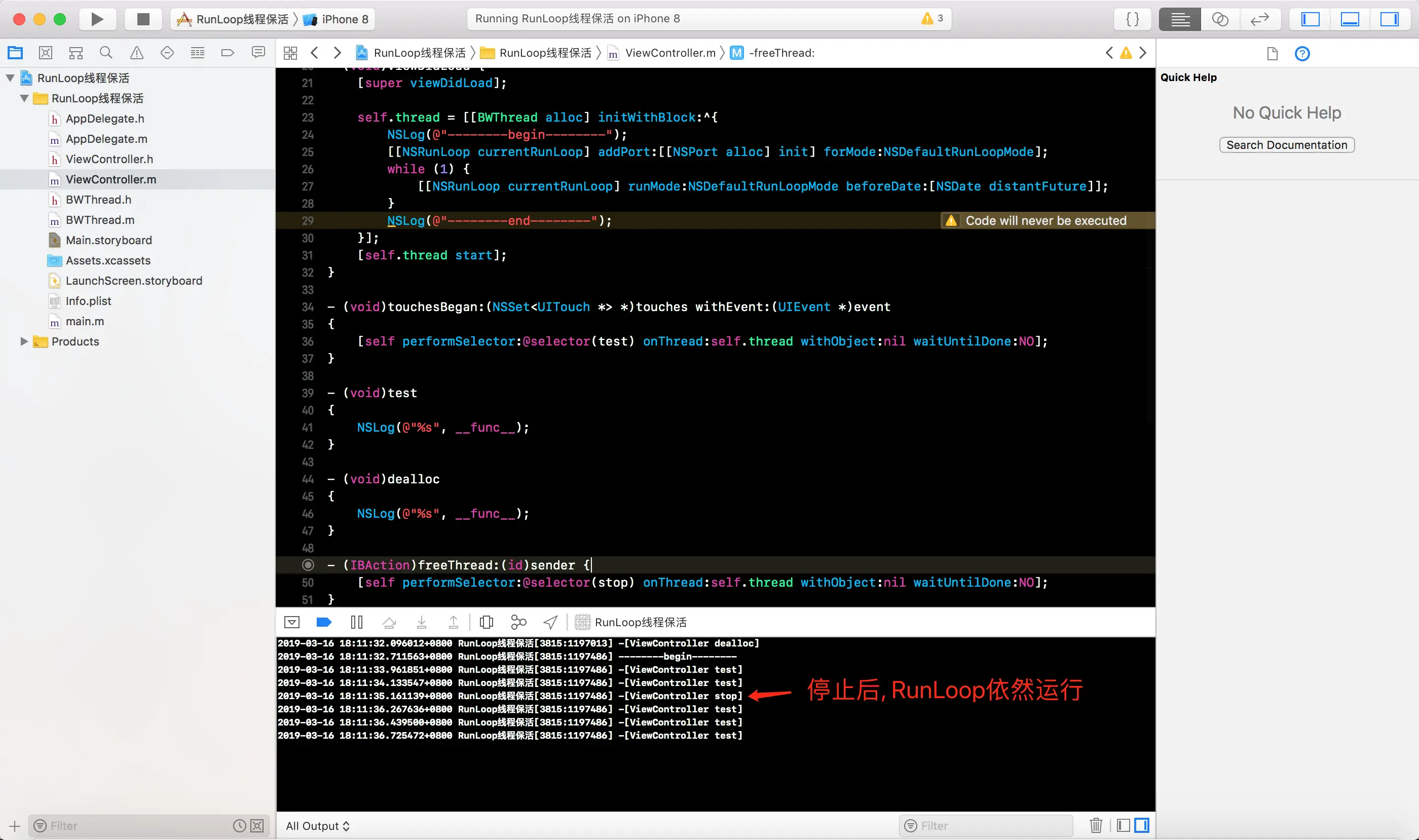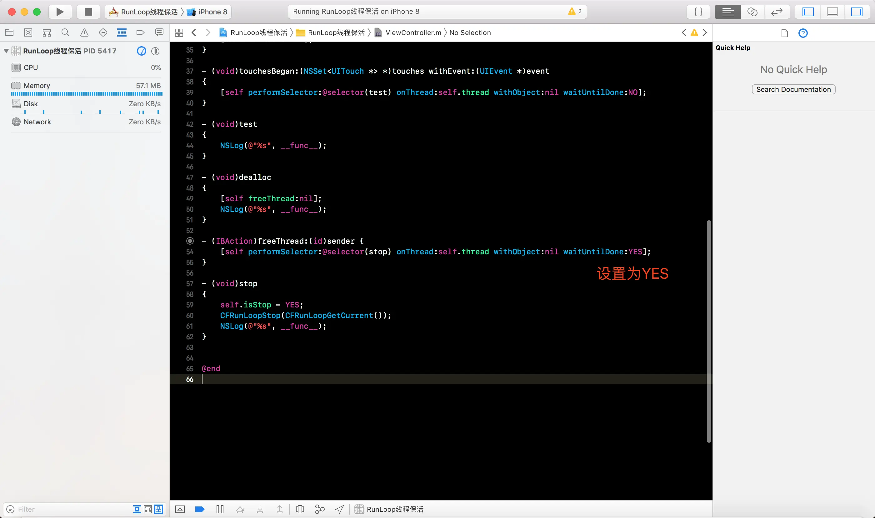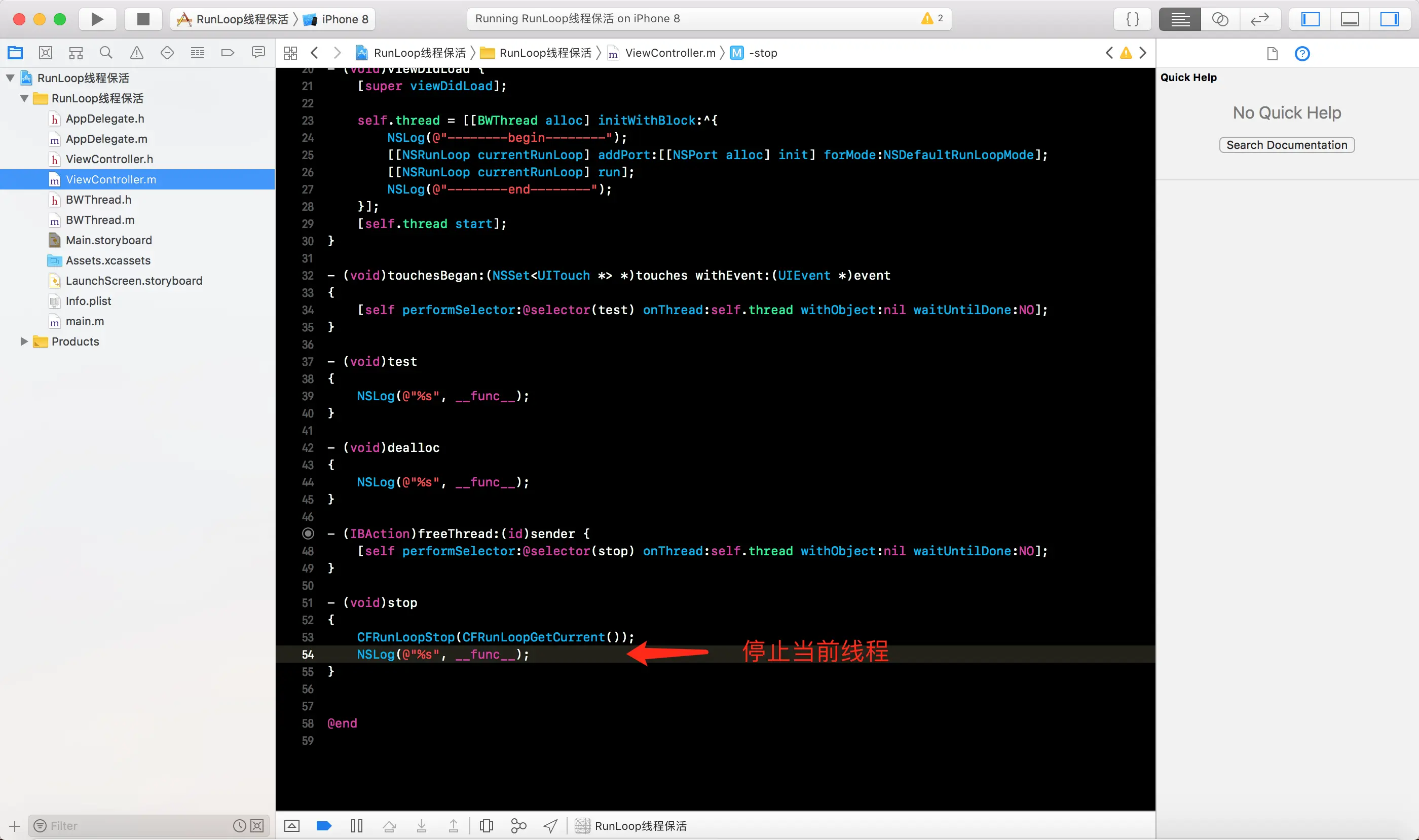 ViewController中代码如下, 当点击释放按钮时, 在thread中停止RunLoop