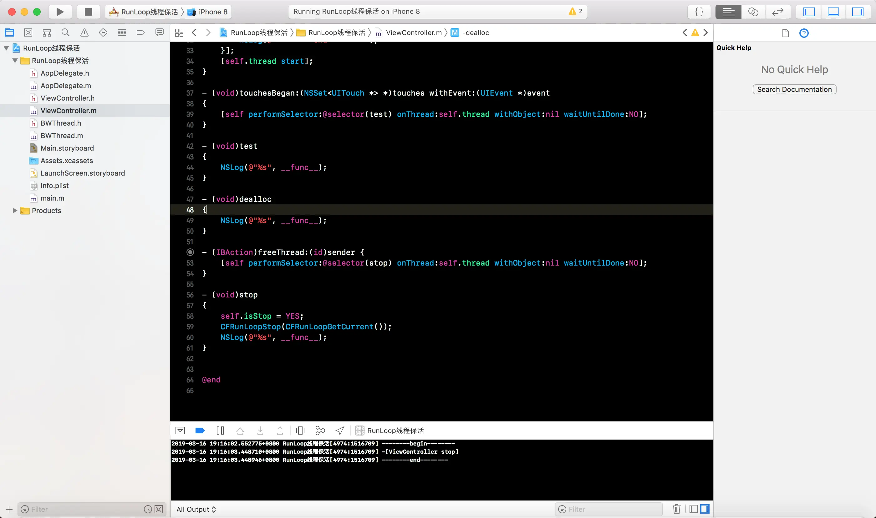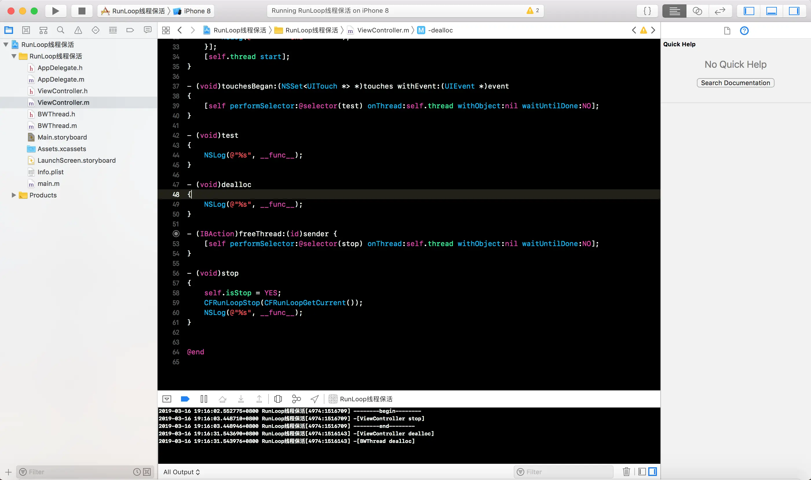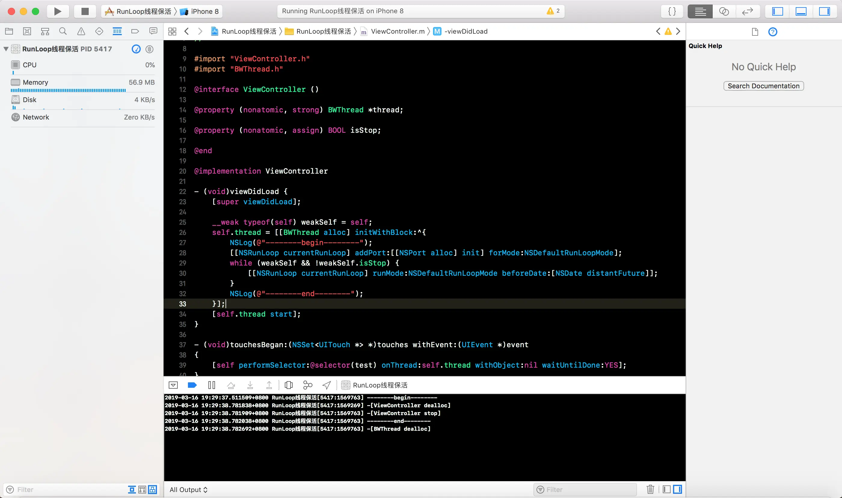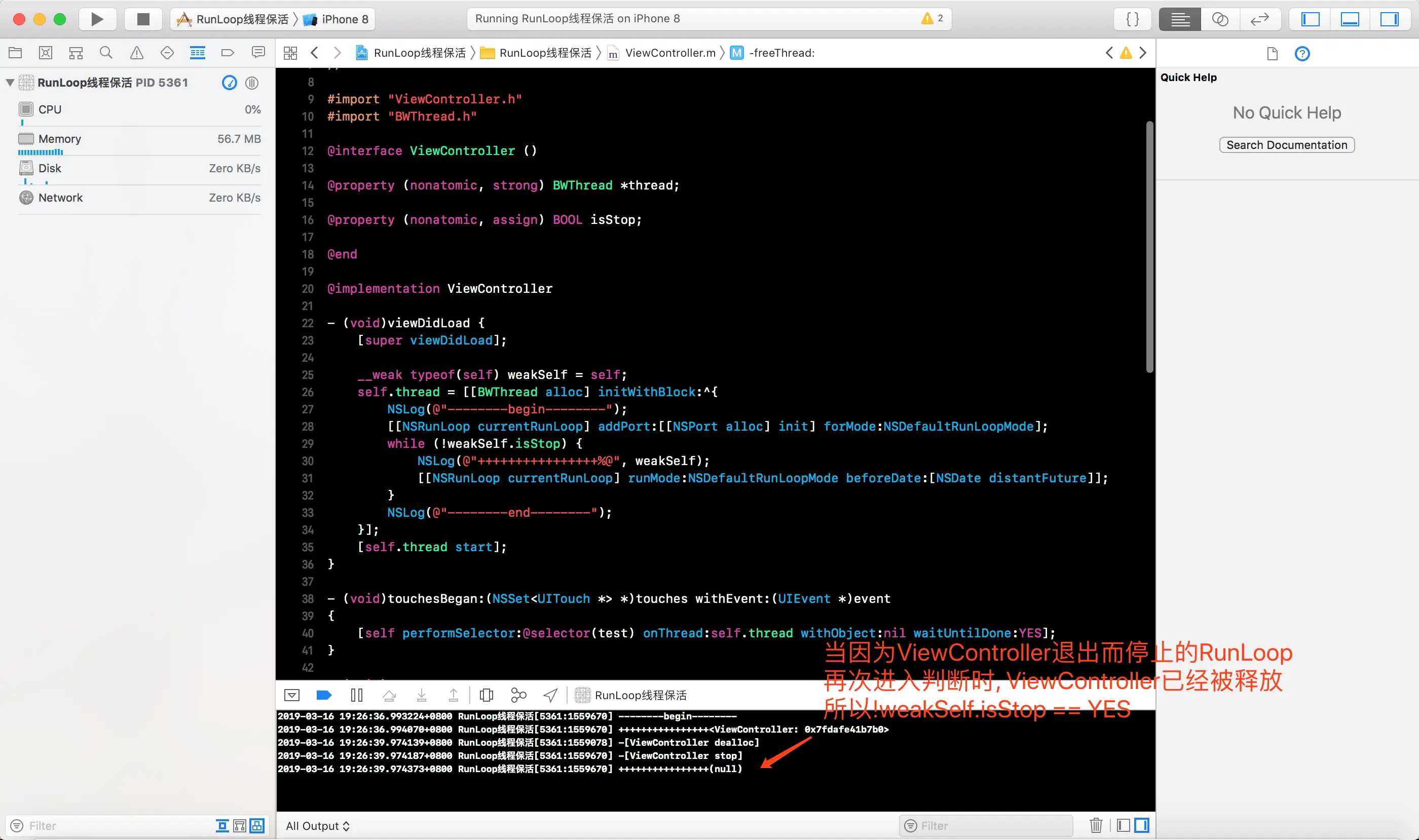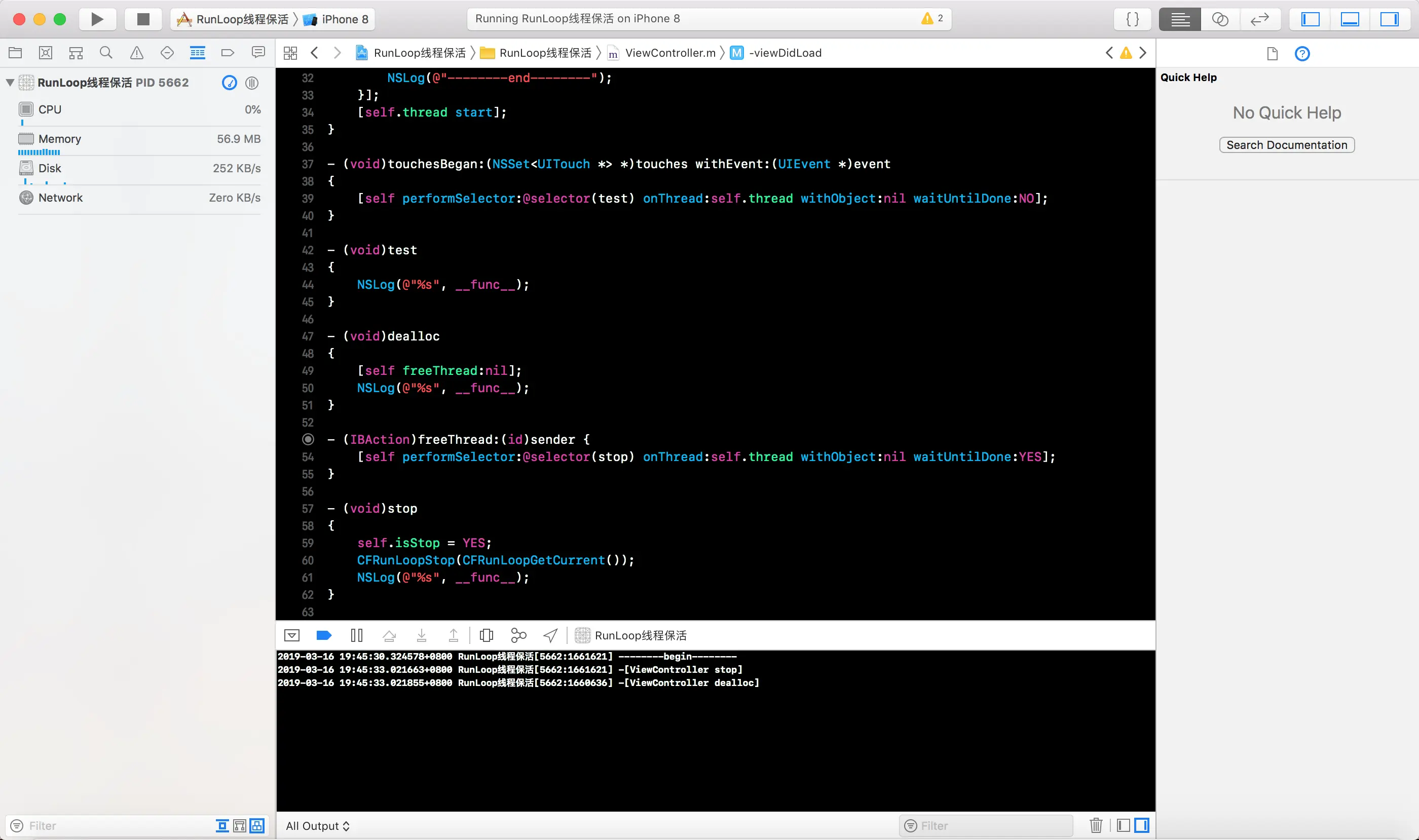 ViewController中代码如下, 当点击释放按钮时, 在thread中停止RunLoop
