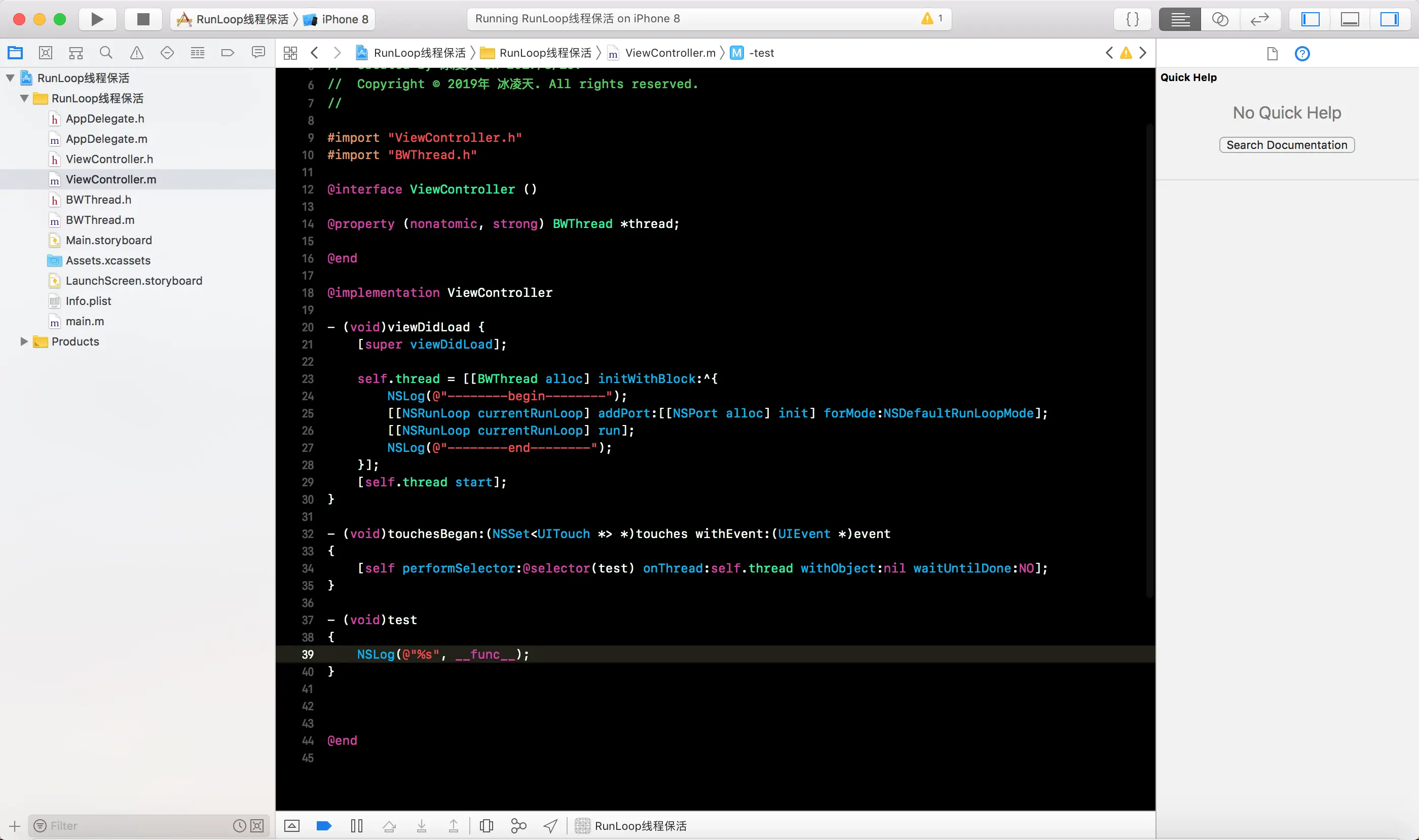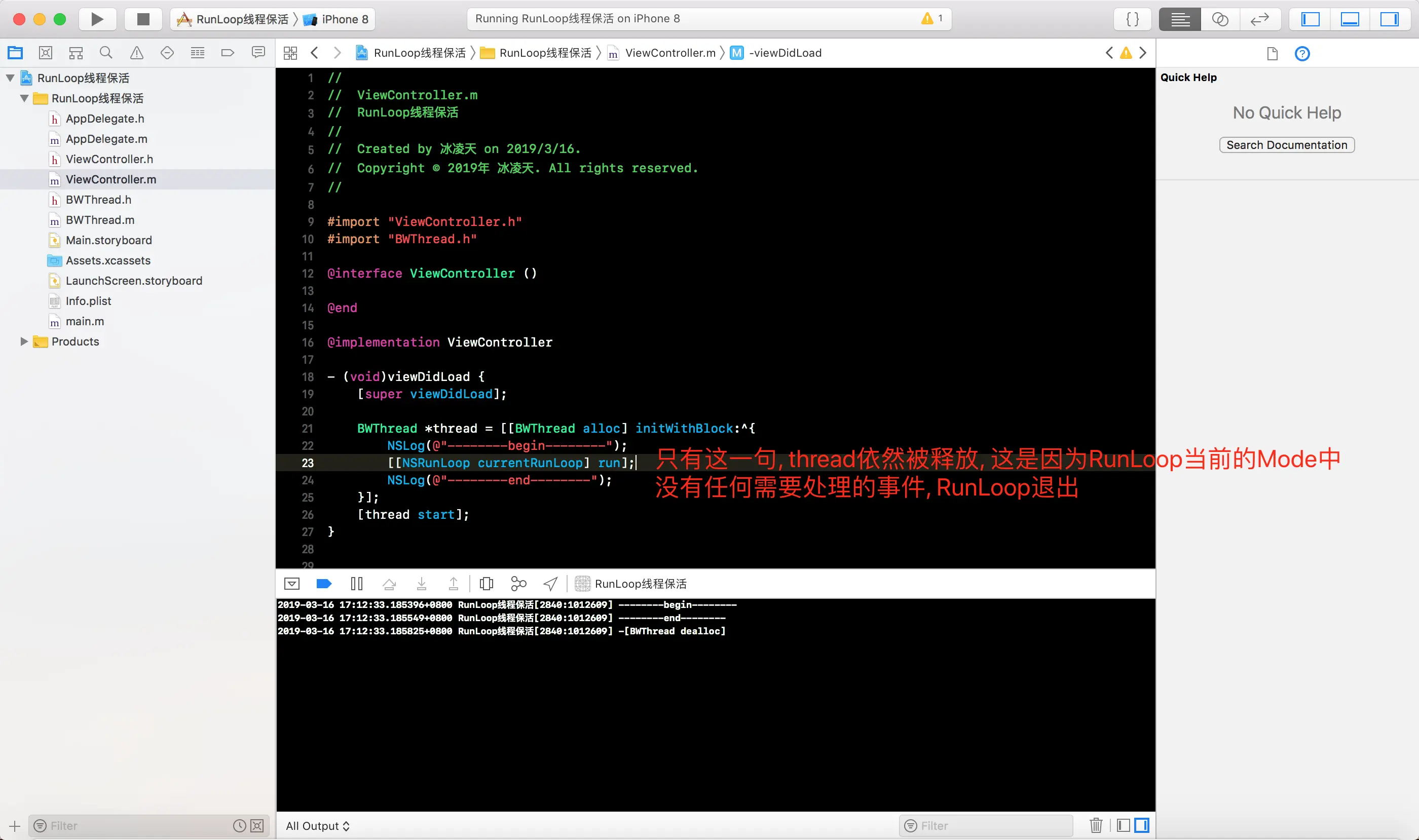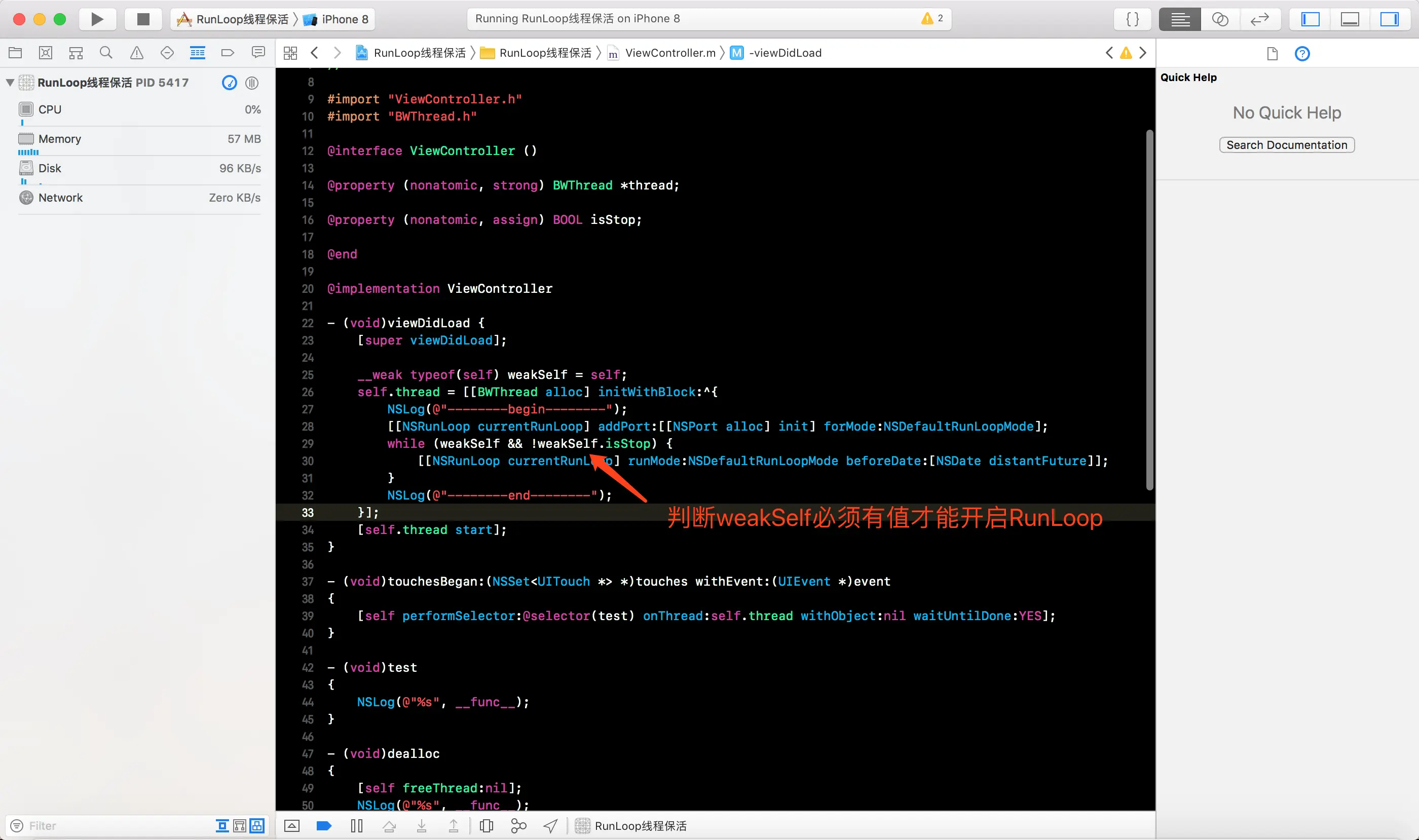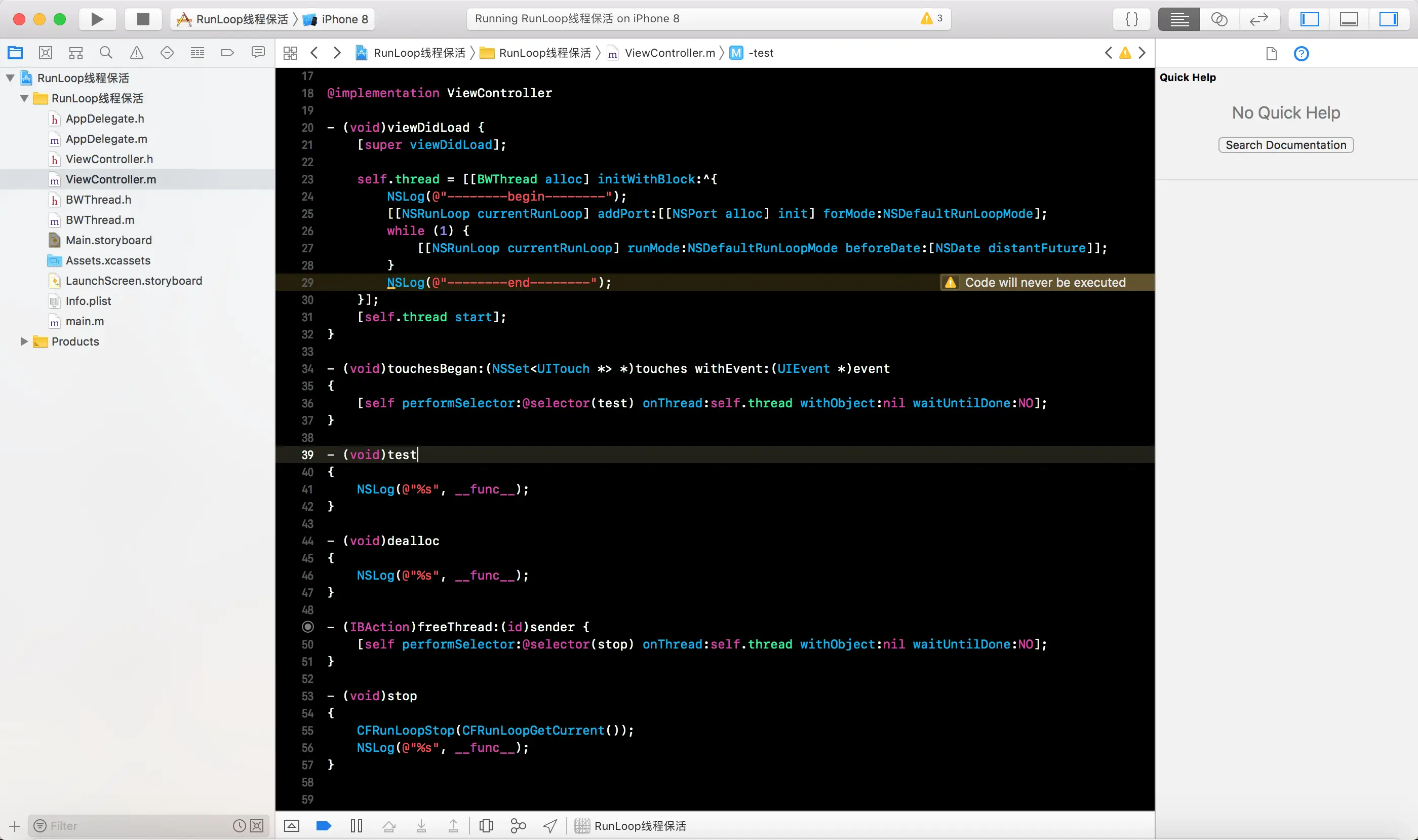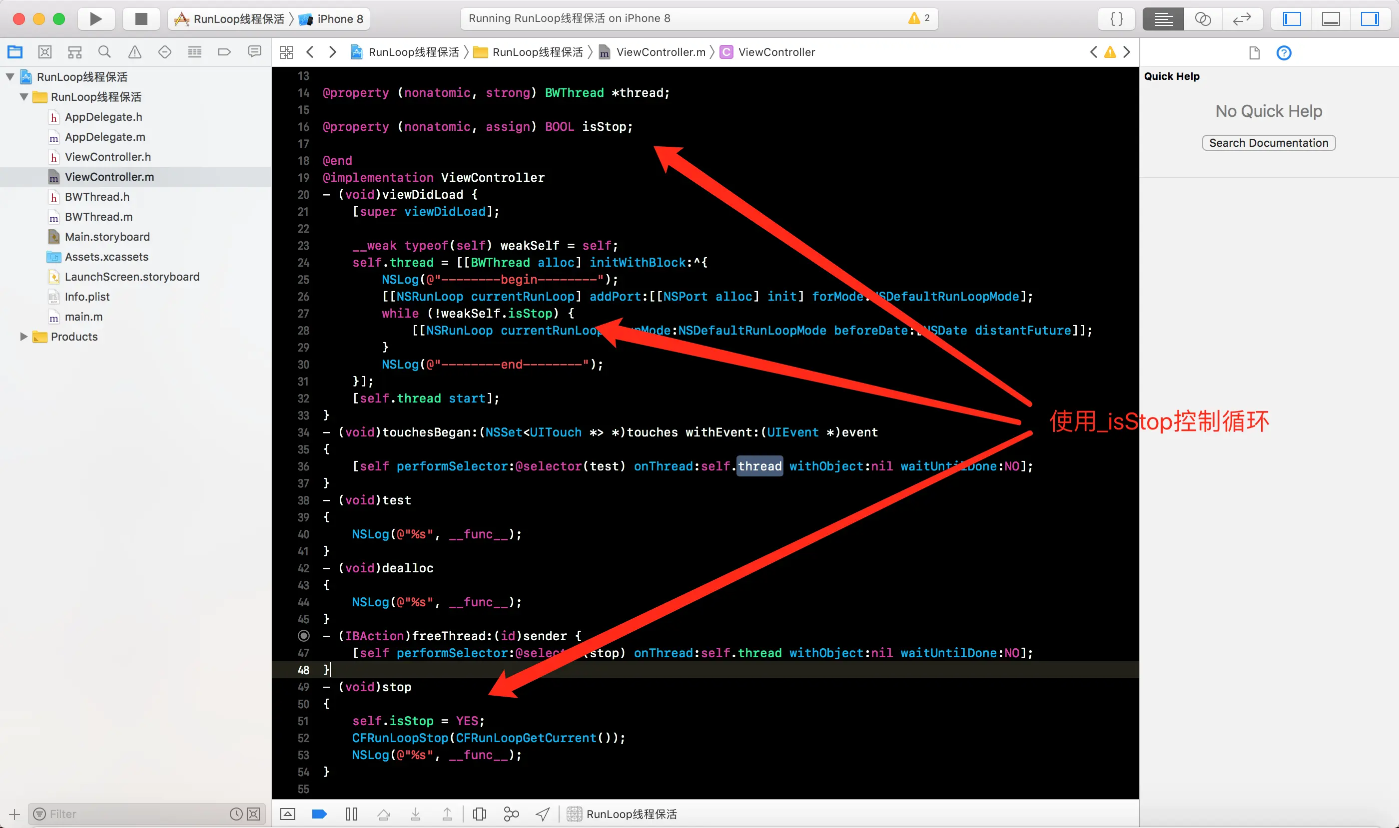 ViewController中代码如下, 当点击释放按钮时, 在thread中停止RunLoop