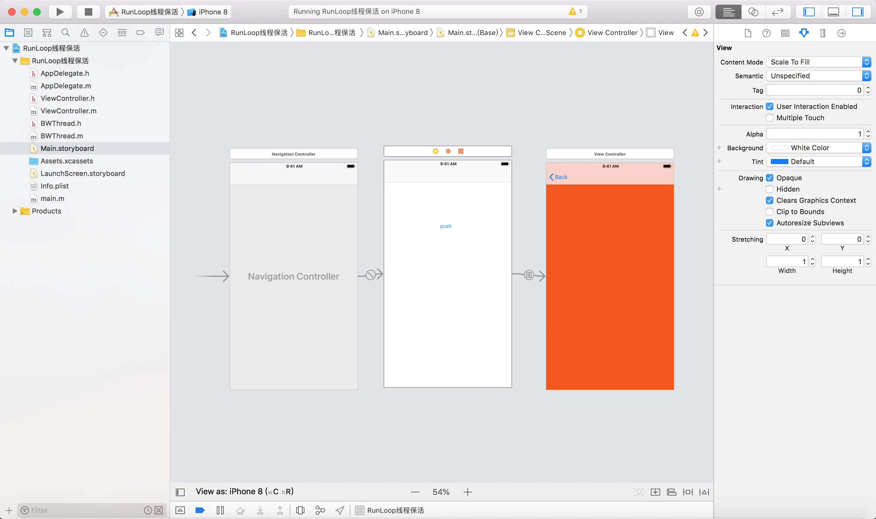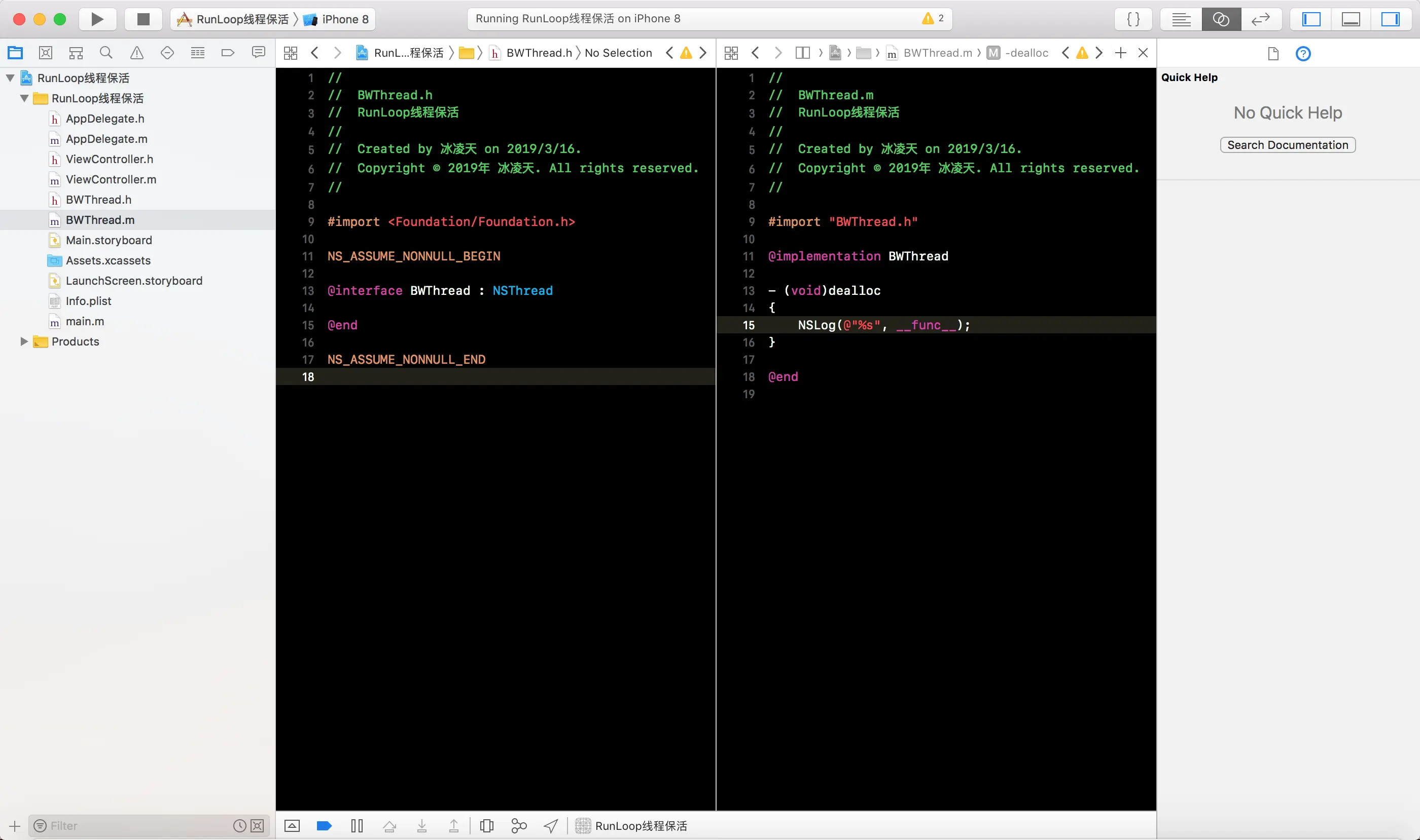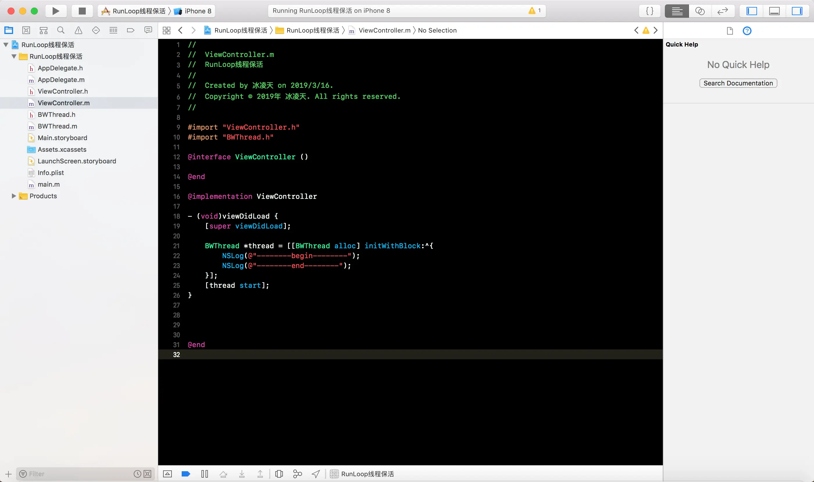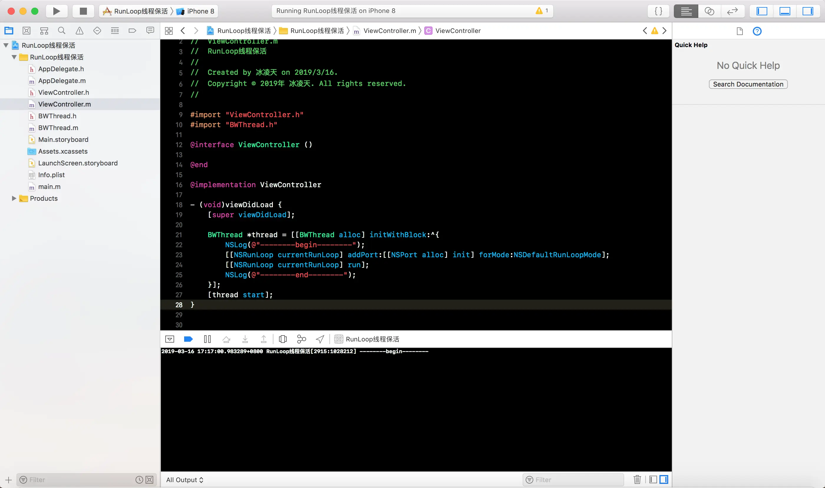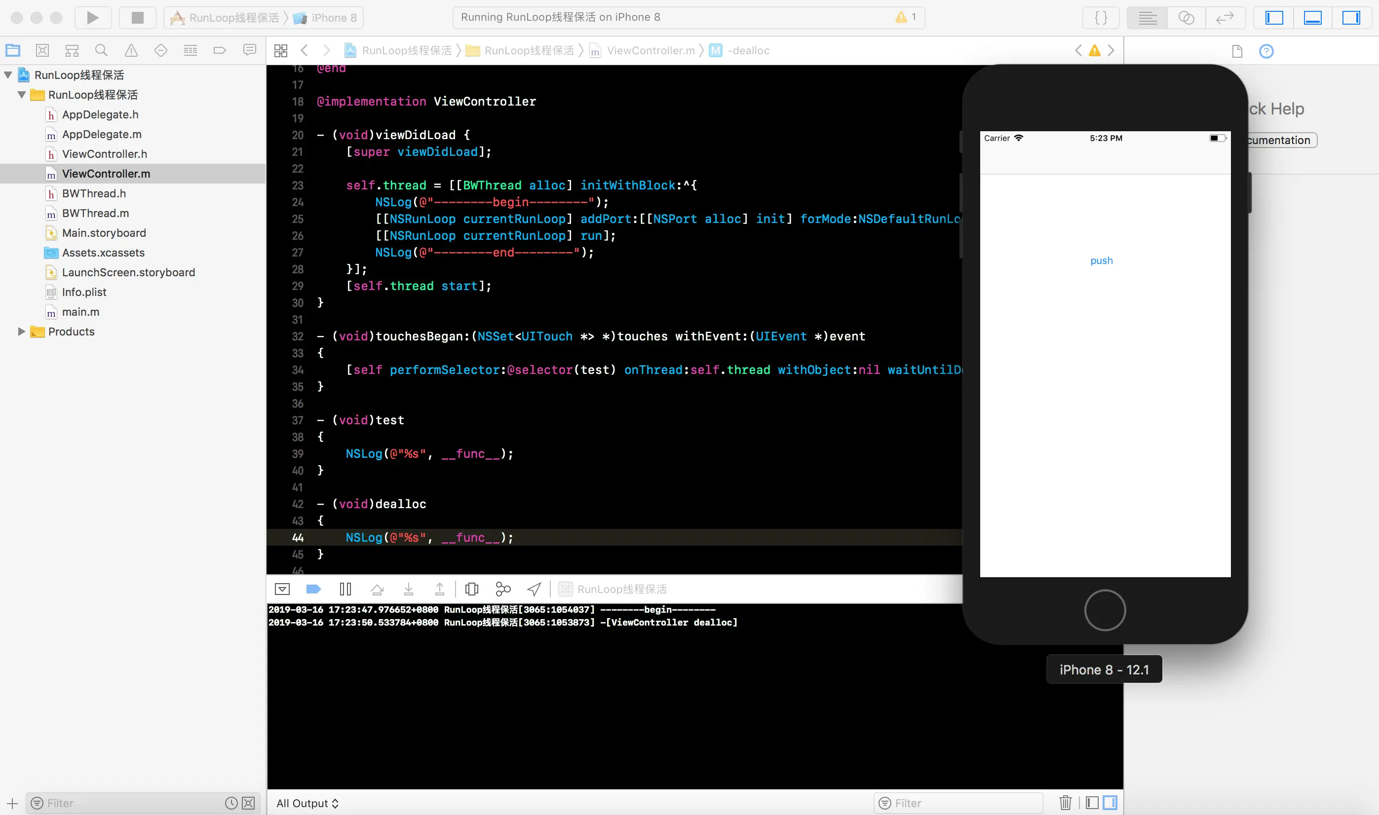 ViewController中代码如下, 当点击释放按钮时, 在thread中停止RunLoop