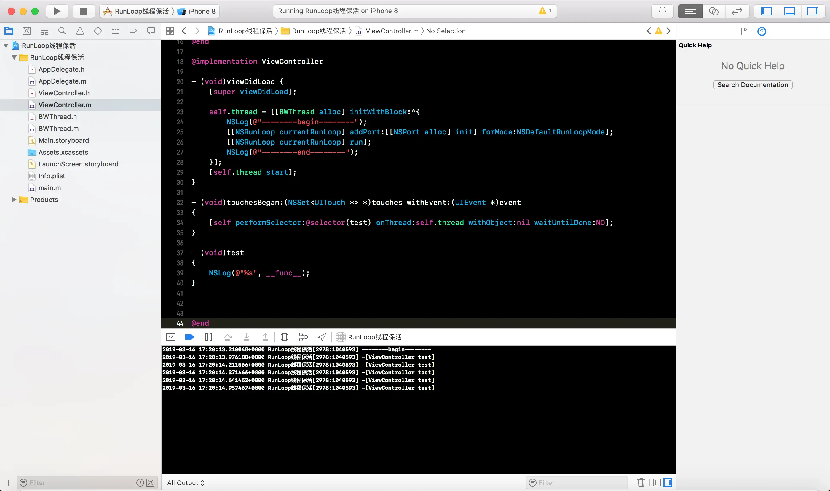 RunLoop, 可以看到,不论怎么点击屏幕, 都不会再有事件, 此时thread就会失活, 所以就算被ViewController强引用, 依然无法保持thread的活性