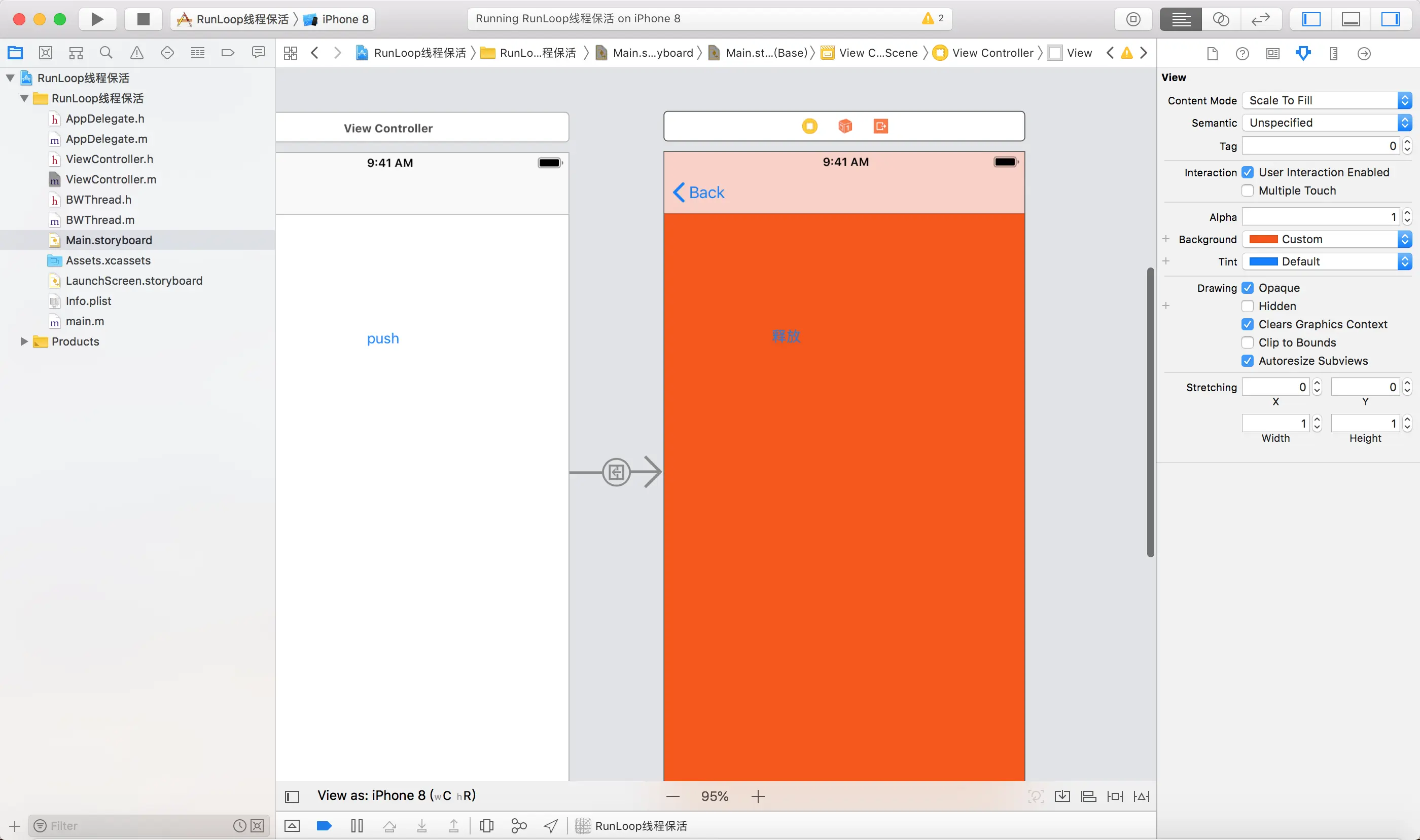 ViewController上添加一个按钮, 我们要在点击释放按钮时, 将RunLoop停止
