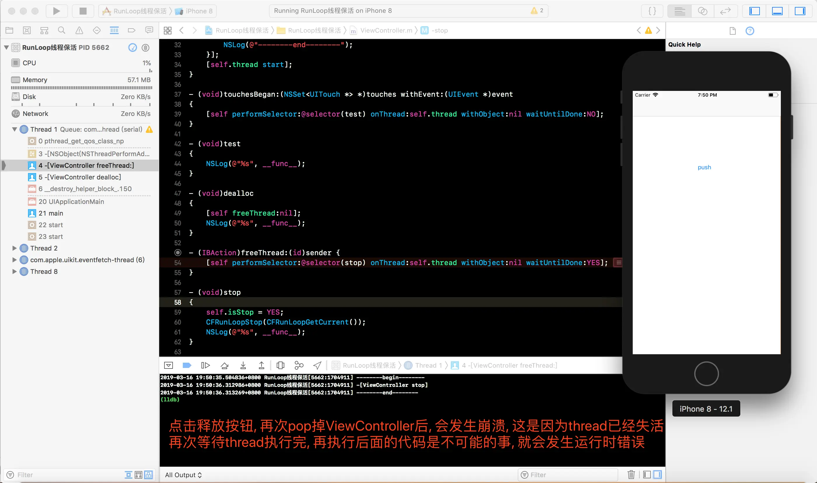 ViewController后, 先点击释放按钮, 使thread失活后再次pop掉ViewController, 可以看到程序正常运行
