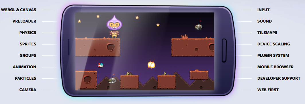 Phaser的功能主要还有预加载、物理引擎、图片精灵、群组、动画等。