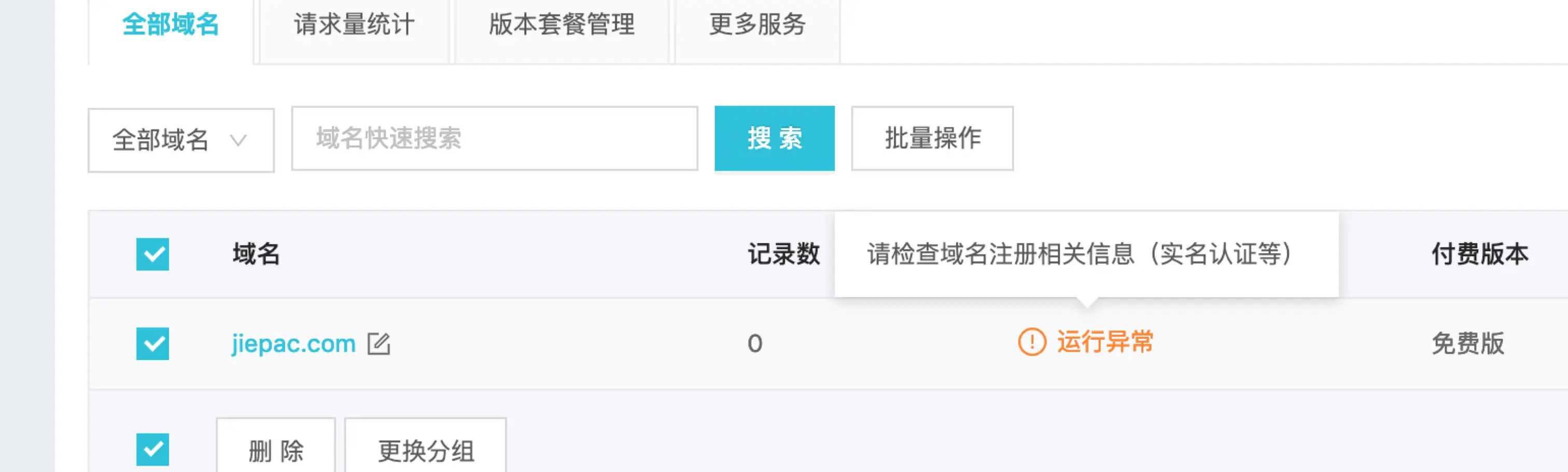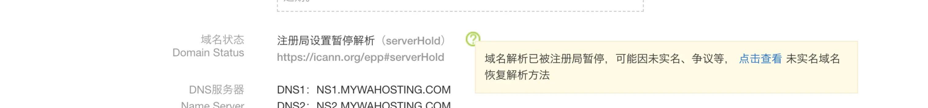 阿里云购买域名最操蛋的还是要属实名认证这个鬼东西了,如果没有实名认证过的域名会一直是下图这个鸟样子,“运行异常”,而且会在注册局层面显示serverHold不可用。