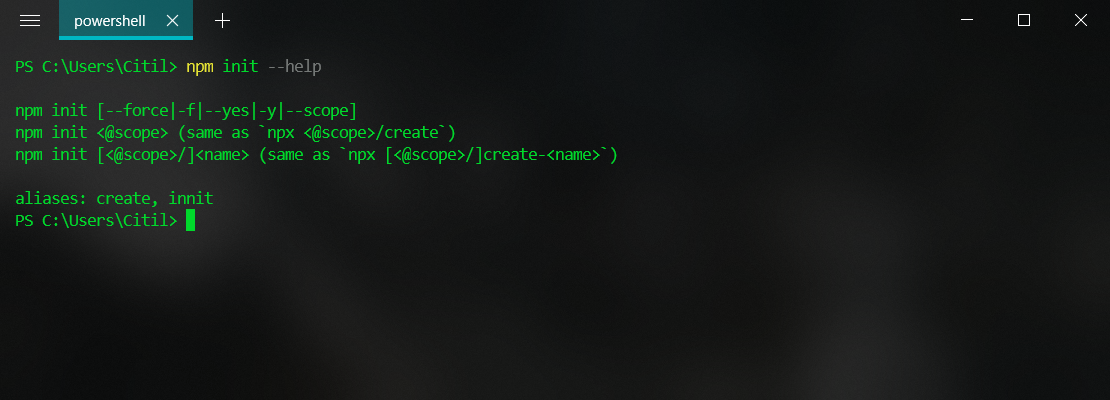 而--help参数则会显示一份简短的说明.可以看到init是有两个别名的, 分别是create和innit, 并且带有四个参数,分别是--force -f, --yes -y --scope,这里要注意的是-f和-y分别是--force和--yes的简写, 对应的结果是一样的.
