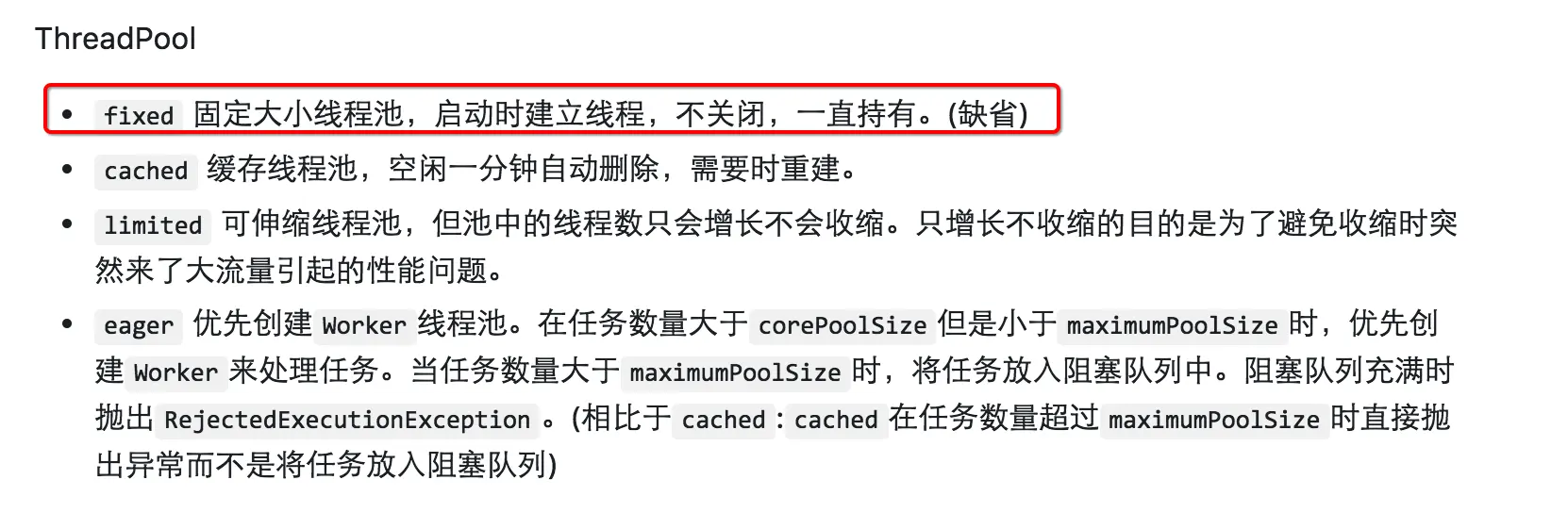 其实换个角度想,规范手册都是阿里出的,阿里手册都强制说要用ThreadPoolExecutor的方式来创建了,而且还给你分析了无界队列的风险,那么Dubbo官方文档说的fixed又怎么会是Executors创建的无界队列这种呢?