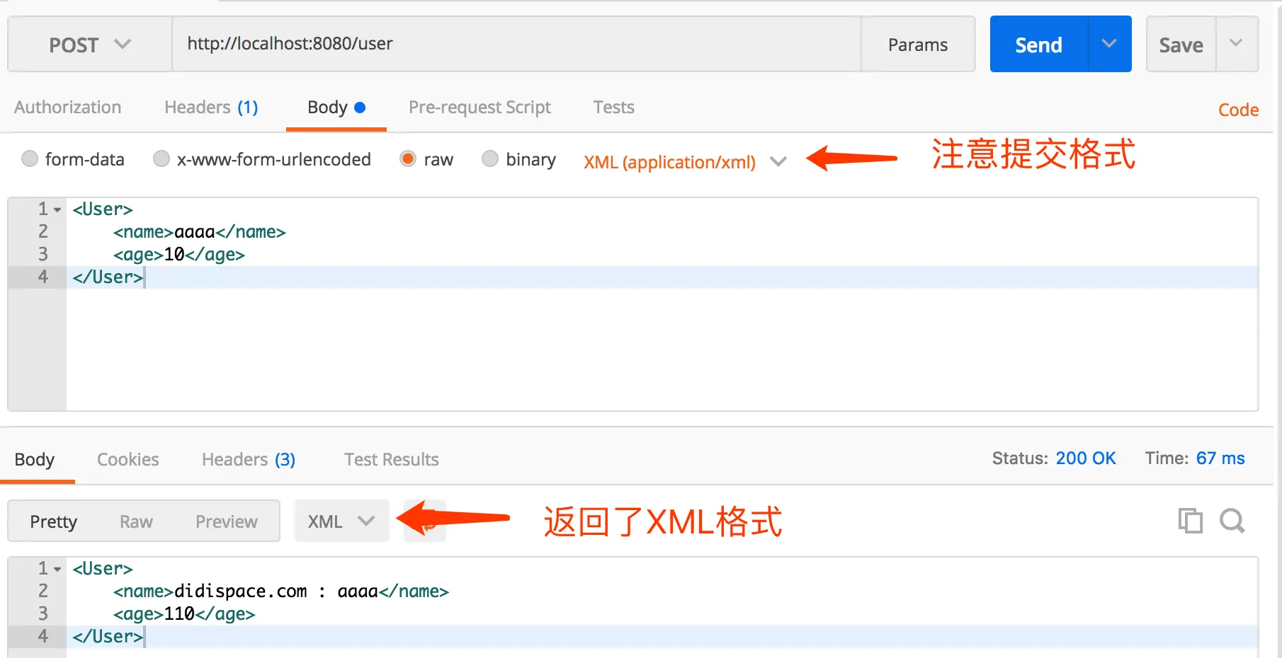 上述配置的User对象,其可以映射的Xml样例如下(后续可以使用上述xml来请求接口):