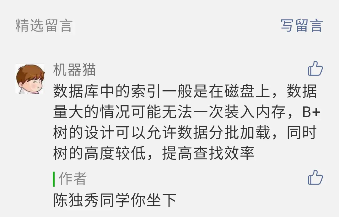 有读者在 mysql索引为啥要选择B+树 (上) 上篇文章中留言总结了选择 B+ 树的原因,大体上说对了,今天我们再一起来看看具体的原因。