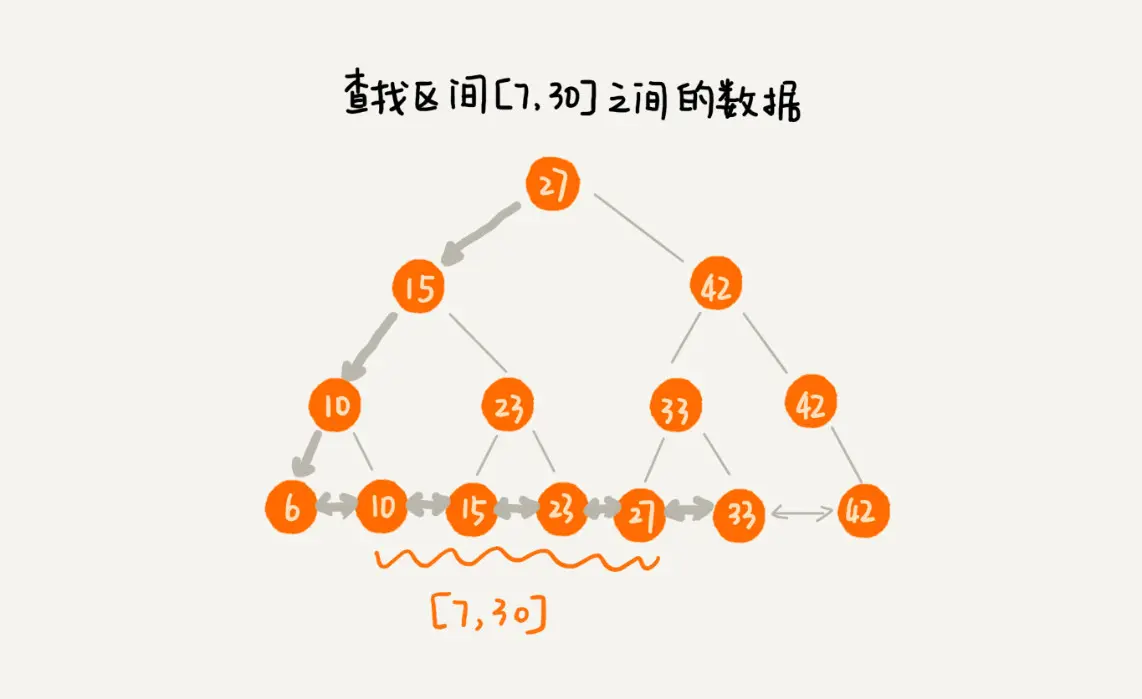 因此只需要先找到区间的起始值在链表中的位置,然后再往后遍历,直到遍历到区间的终止值,即可完成区间查询。如下图查找 7-30 这个区间的数据。