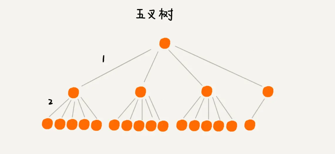要想树变矮一些,那就把树多分一些叉来吧,变成一颗多叉树。下面分别用二叉树和五叉树来存储 16 条数据,看下树的高度又怎样的变化。