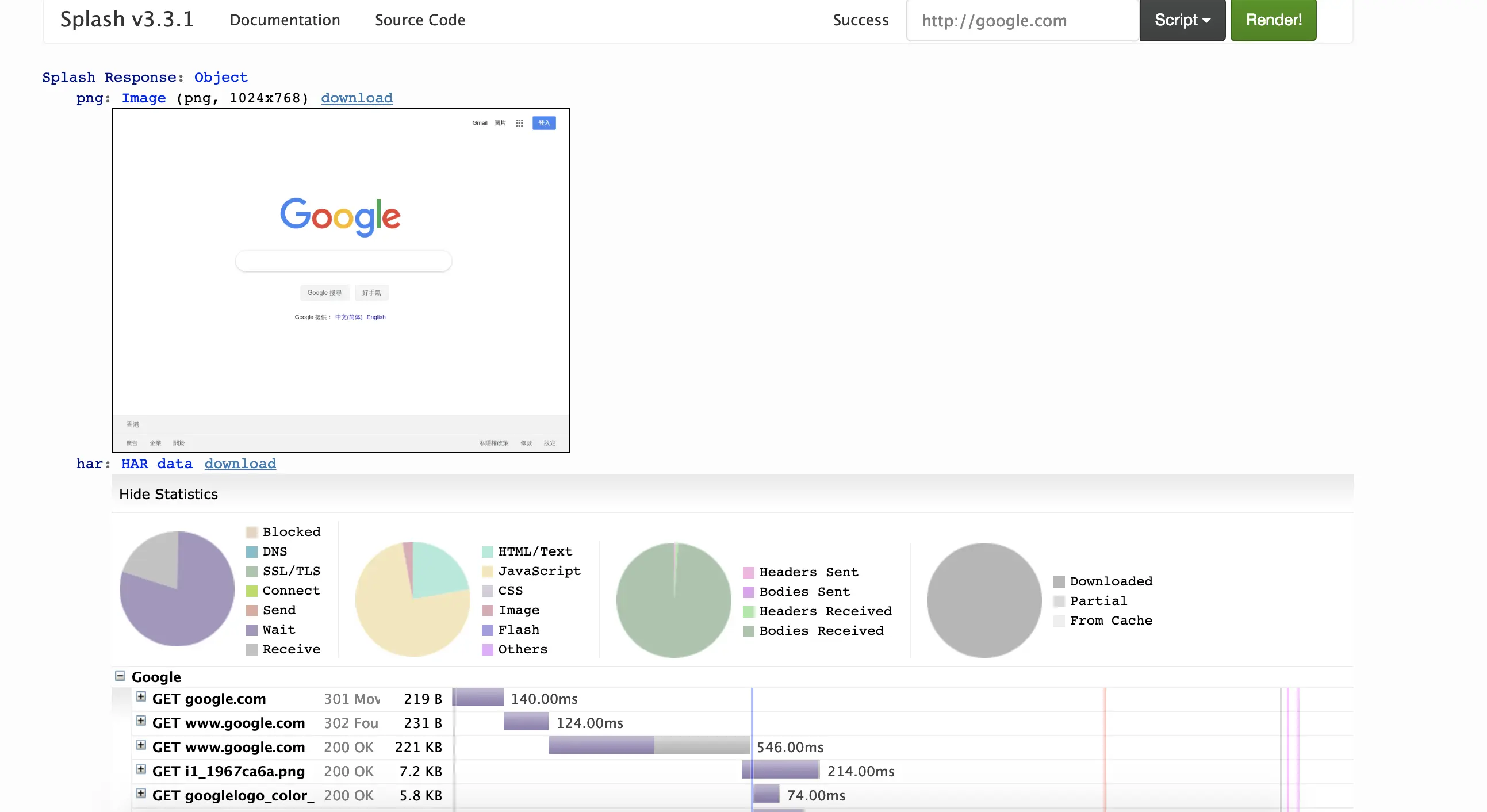 Splash上默认的是http://google.com的地址,点击渲染,就能看到网页的返回结果呈现了渲染截图、HAR 加载统计数据、网页的源代码