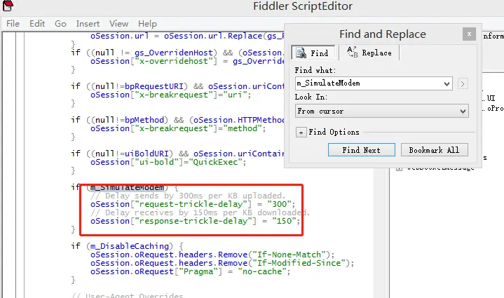 oSession["response-trickle-delay" ] = "150";(每下载1KB延迟150ms)