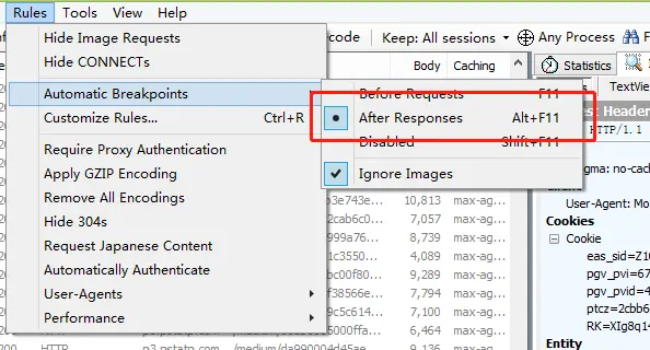 5.oSession["request-trickle-delay" ] = "300";(每上传1KB延迟300ms)