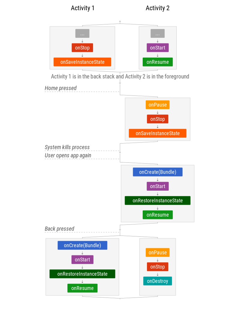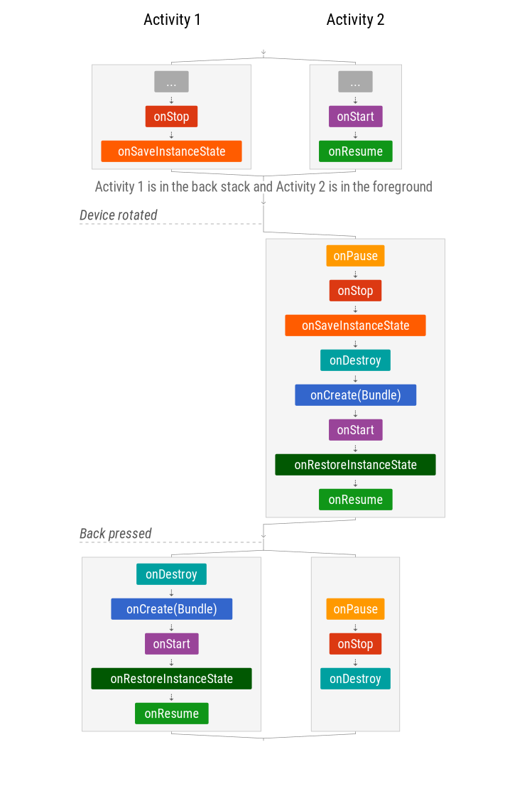 请注意,尽管 onSaveInstanceState 被调用,但是 onRestoreInstanceState 不会被调用。如果在第二个 activity 处于活动状态时配置发生改变,则第一个活动将被销毁并仅在其重新获取焦点时重新创建。这就是保存一个状态的实例很重要的原因。