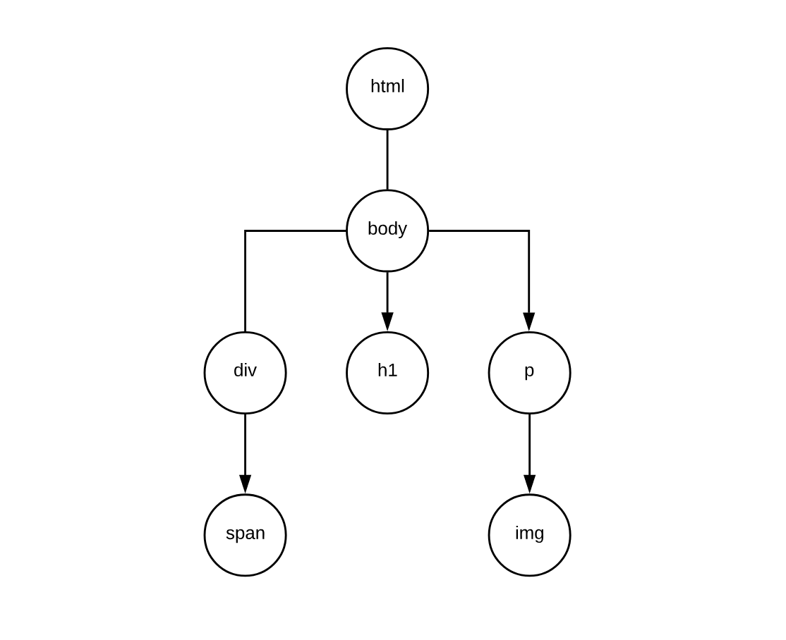 我们开始自下而上构建这个树结构。这意味着从嵌套最深的结构起来构建这个结构,一直到 body 和 html 节点。让我们来看一下这个树结构的图形: