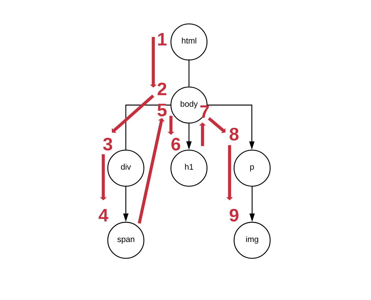 这个算法开始就像 BFS 一样 —— 它从 html 到 body 再到 div 节点。然后,与之不同的是,该算法并没有继续遍历到 h1 节点,它往叶节点 span 前进了一步。一旦它发现 span 是个叶节点,它就会返回 div 节点以查找其它分支去探索。因为在 div 也找不到,所以它会移回 body 节点,在这个节点它找到了一个新分支,它就会去访问该分支中的 h1 节点。然后,它会继续之前同样的步骤 —— 返回 body 节点然后发现还有另一个分支要去探索 —— 最后会访问到 p 和 img 节点。