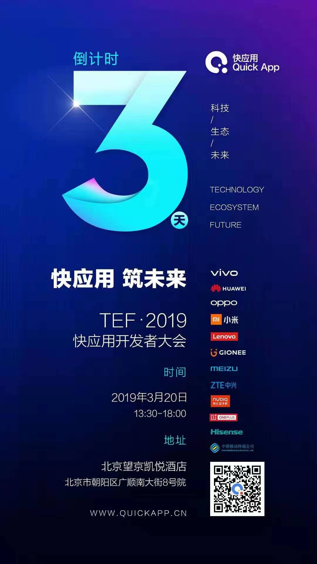 拓展安卓应用新生态,开启移动发展新篇章。2019年3月20日,值快应用平台成立一周年之际,TEF 2019 快应用开发者大会将在北京望京凯悦大酒店举办。在本次大会中,国内知名手机厂商、应用服务商等将齐聚一堂,共同探讨与交流移动应用发展前景及快应用未来发展新动态。